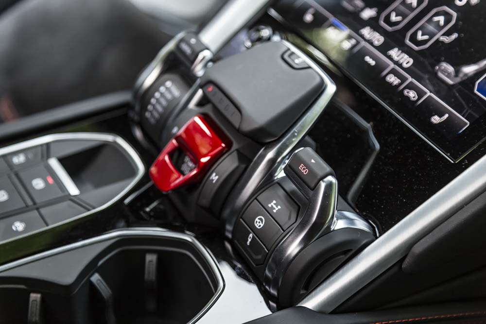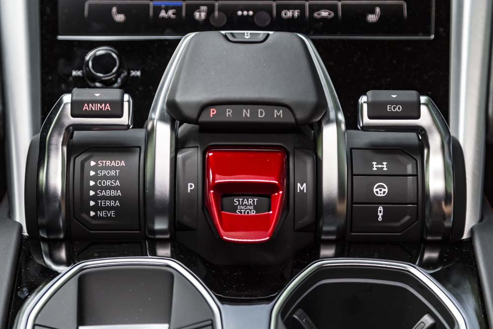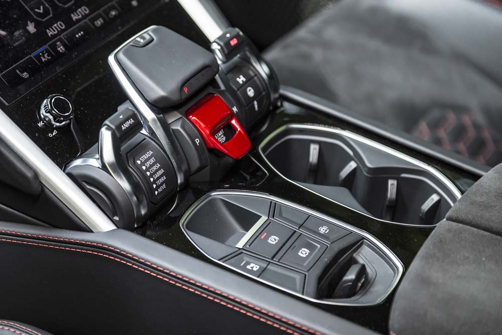 Însă piesa centrală este selectorul Tamburo. Tamburo nu este un buton ci desemnează un concept de comenzi pentru reglajul trenului de rulare. Mai aproape de șofer este selectorul Anima din care se pot alege modurile Strada, Sport, Corsa și Neve (standard) plus Terra și Sabbia (600 euro), caz în care suspensia pneumatică adaptivă se ridică și se mărește garda la sol. În dreapta există un selector care arată similar, numit Ego, preluat de la Aventador și care este practic un mod individual de reglaj al trenului de rulare cu trei butoane: pentru răspunsul direcției, suspensiei și al distribuției cuplului față spate. Între cele două selectoare se află selectorul cutiei de viteze care arată ca o manșă de yacht și sub el o clapetă roșie sub care se ascunde butonul de start. Pornim motorul, dar ca să plecăm din loc nu folosim selectorul cutiei ci apăsăm frâna și tragem din padela din dreapta volanului. Se cuplează treapta I din modul Drive. Dacă tragem de ambele padele în același timp se cuplează modul N, în timp ce pentru P și R avem butoane pe selectorul cutiei de viteze. Există și un mod Manual tot pe selectorul cutiei de viteze.