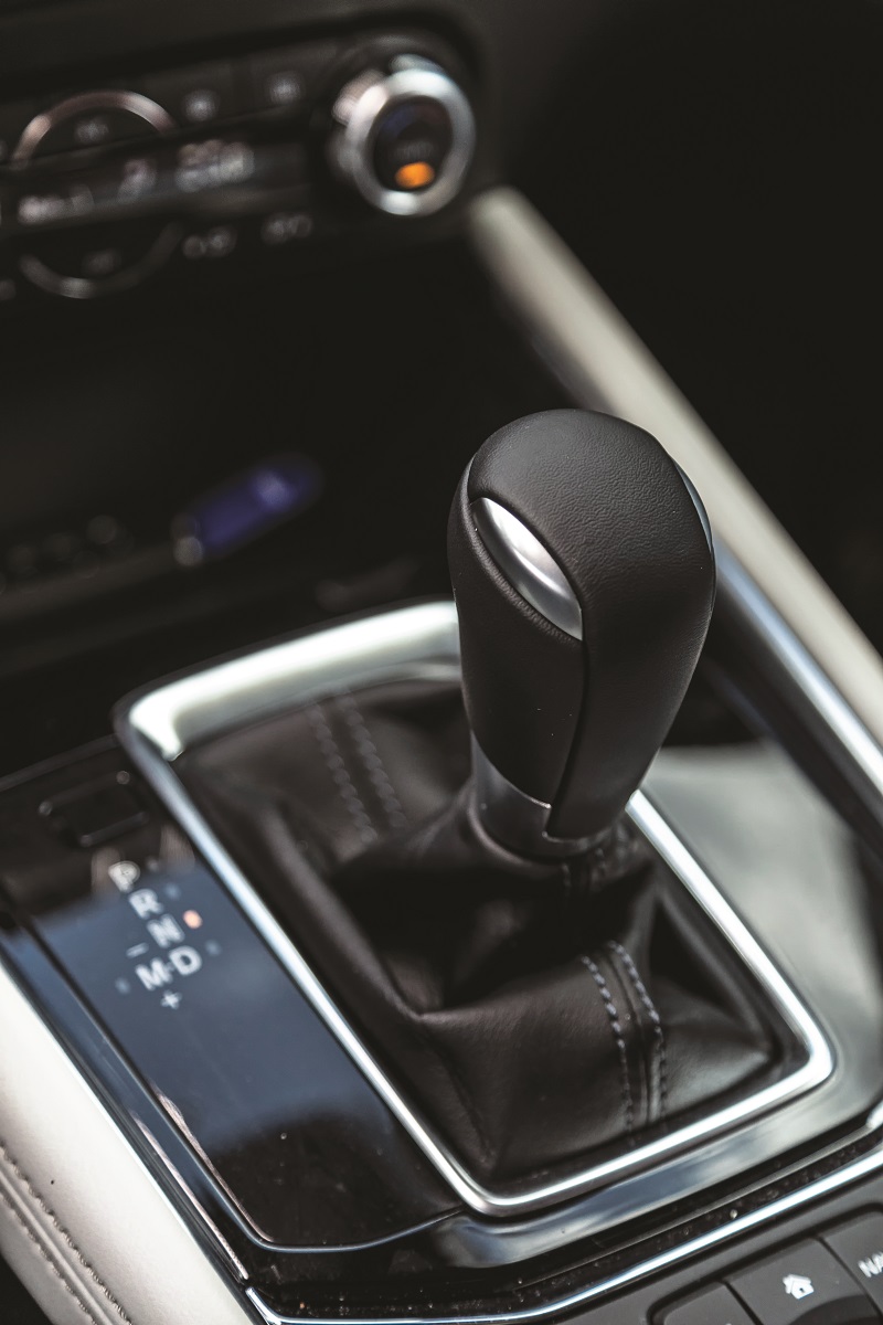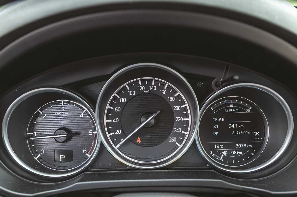 Totuși, consumul pe autostradă, de 8,1 l/100 km nu reflectă din plin toate măsurile de eficiență aplicate de Mazda. În oraș, consumul de combustibil se situează la numai 8,5 l/100 km, dar în condiții de aglomerație am atins 10,6 l/100 km. Șoferul se bucură de o bună vizibilitate, dar diametrul relativ mare de bracaj afectează întrucâtva manevrabilitatea. Suspensia filtrează doar decent denivelările scurte, din cauza jantelor de 19 inch, însă nu devine inconfortabilă și lucrează silențios. Din păcate, la echiparea Top Revolution nu se pot comanda jante cu diametru mai mic. Ies pe drum național, unde descopăr adevăratul potențial al motorului bi-turbodiesel: accelerează puternic încă de la 1.200 rpm și rămâne incredibil de liniștit chiar și după 4.000 rpm. Schimburile de trepte se realizează rapid și lin, și nici atunci când m-am aventurat în viraje strânse nu am surprins cutia în offside. Chiar și mai mult mi-a plăcut sistemul de direcție care transmite un feedback superior majorității concurenților și este asistat de sistemul servo exact atât cât trebuie. În plus, noua generație primește standard sistemul G-Vectoring Control, care ameliorează comportamentul la limită pe viraje: mașina se simte incisivă, fără să se încline exagerat, însă aderența anvelopelor Toyo Proxes știrbește un pic distracția.