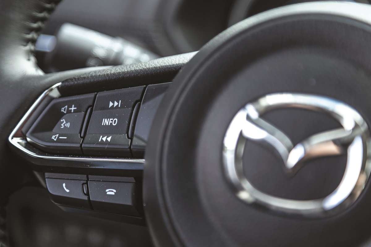 La noul CX-5, ecranul multimedia a fost mutat mai sus, deasupra bordului, fiind mult mai vizibil, ca și la MX-5. Șoferul rămâne mai atent la trafic, pentru că ochii săi se rotesc cu doar 15 grade ca să citească ecranul (față de 23 de grade înainte). Ca și înainte, sistemul beneficiază de un controller generos dimensionat, aflat pe tunelul central și înconjurat de cinci butoane, asemenea celor ale sistemului iDrive de la BMW, care permit trecerea simplă printre meniuri. De exemplu, căutarea contactelor din agenda telefonică durează doar câteva momente. Pe loc și la viteze de până la 7 km/h, sistemul multimedia poate fi comandat și folosind ecranul tactil. Comenzile vocale pentru telefon funcționează bine, dar nu înțeleg toate cuvintele, ci doar pe cele preinstalate. Din păcate, sistemul nu este compatibil cu interfețele Android Auto și Apple CarPlay.