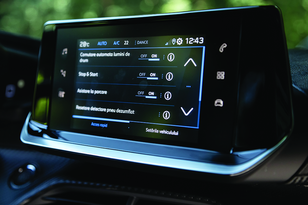 Peugeot a redus numărul de butoane fizice la doar câteva, iar cele mai multe funcții, inclusiv cele ale climatizării, sau oprirea sistemului start-stop se face doar prin intermediul display-ului central. Volumul pentru sistemul audio a rămas pe un buton rotativ, iar restul de butoane fizice sunt forma unor clapete folosite pentru cateva comenzi rapide pentru climatizare, închidere centralizată și dezaburire. Pentru acționarea încălzirii în scaune sunt folosite două comenzi touch, care răspund ceva mai greu la atingere.