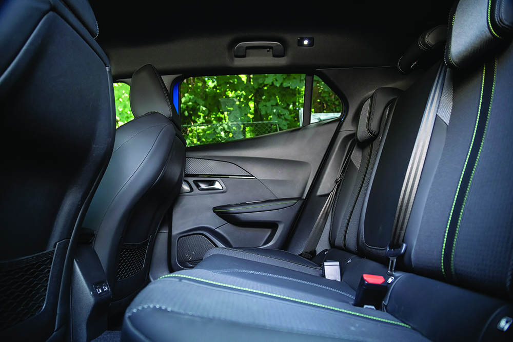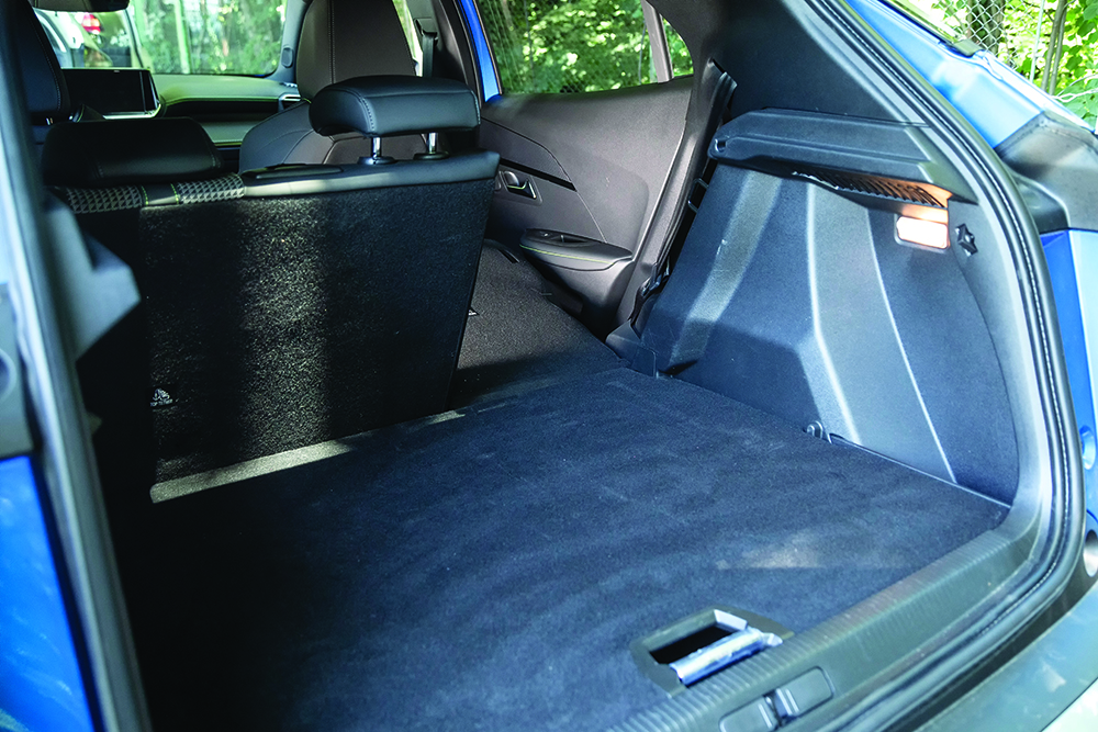 Interiorul cu tentă futuristă este suficient de încăpător pentru patru sau chiar cinci pasageri, iar portbagajul oferă un volum de încărcare de 434 litri (cu 125 litri mai mult față de modelul Peugeot 208). Există și un spațiu de încărcare suplimentar sub podeaua portbagajului. Instrumentele de bord sunt digitale, iar planșa din fața celui de la volan oferă un efect 3D ce afișează informațiile pe mai multe planuri. Display-ul poate fi configurat în funcție de preferințele șoferului, dar grafica atât pe display-ul central, cât și pe cel din fața celui de la volan nu este cea mai atrăgătoare.