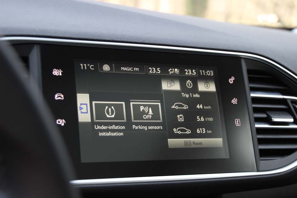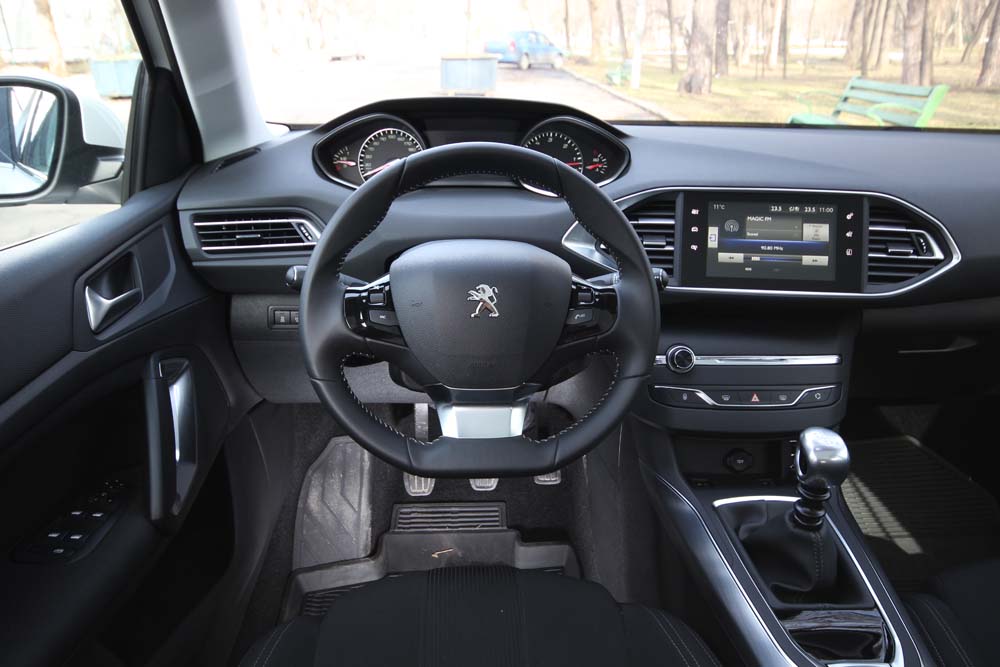 Daca exteriorul intra in categoria rezervat, atunci la interior lucrurile se aseaza pe o directie ceva mai surprinzatoare. Strategia inceputa de 208 bazata pe doua puncte centrale volanul foarte mic si ecranul dominant de pe consola centrala a fost aplicata si lui 308 cu rezultate interesante. Pentru inceput merita salutata atmosfera foarte aeristita de la bord cu doar 4 butoane fizice pe consola centrala, restul comenzilor (audio si climatizare) fiind integrate in ecranul tactil cu diagonala de 7″. Fiecare zona de control are cate o tasta capacitiva desemnata pe lateralele ecranului, dupa care diferitele setari pot fi apelate direct pe touchscreen.