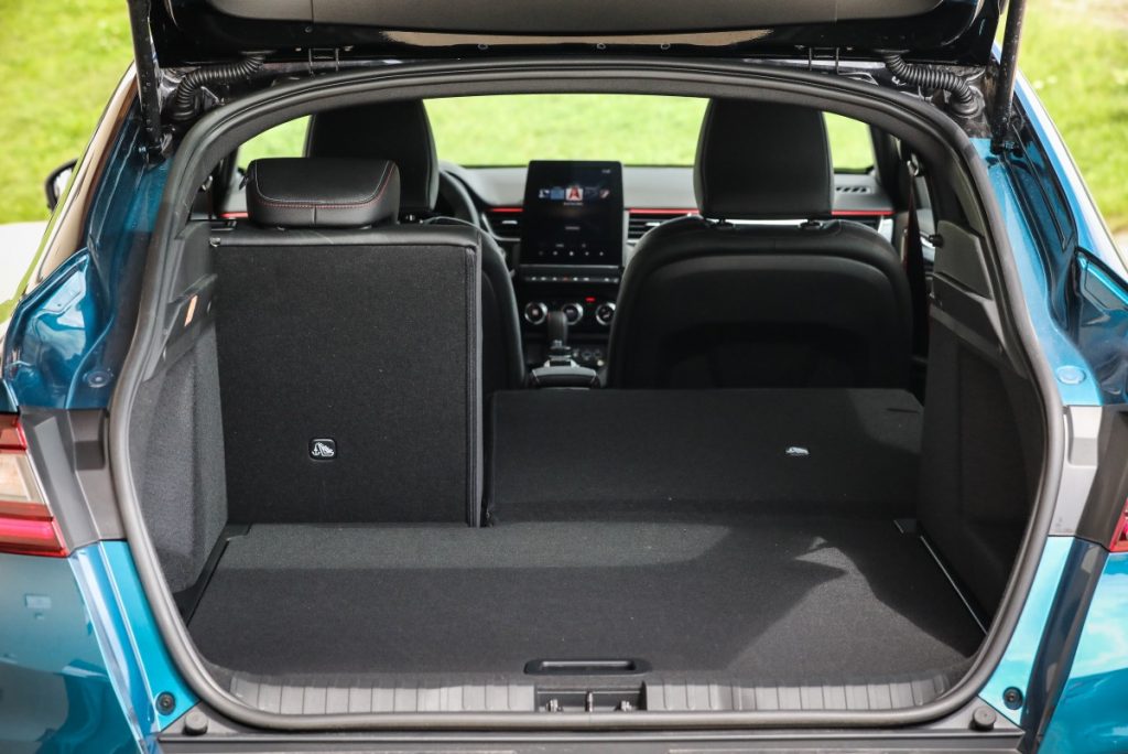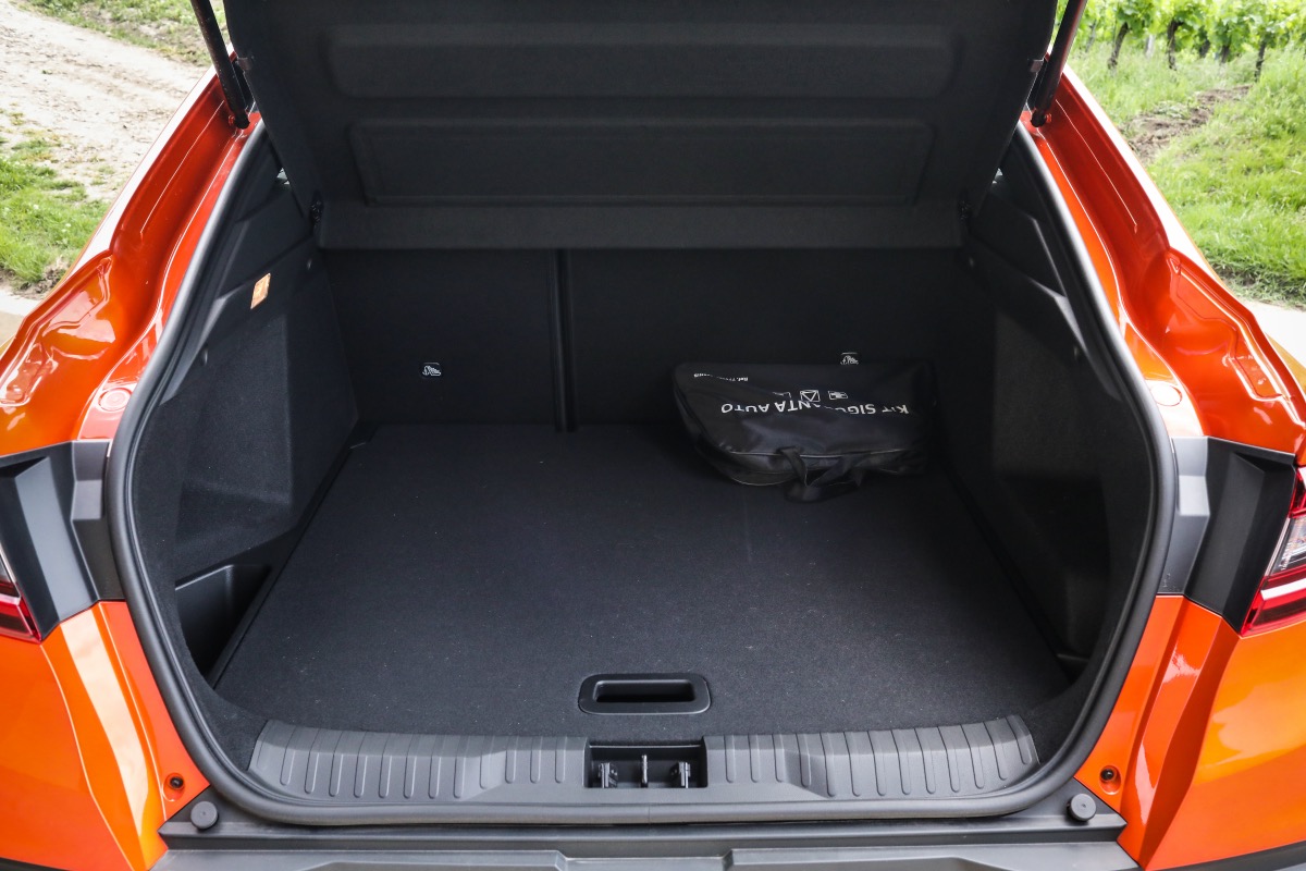 Mare. Francezii îl creditează cu 513 l, sau cu 468 l în cazul viitoarei versiuni E-TECH. Eu am rămas surprins de cât de mare e, în special în lungime. Plus că mai are spațiu și sub podeaua amovibilă. Nu are, însă, ochiuri de prindere a plasei de amarare, priză de 12V, sau clapete de rabatare a banchetei. Dar are spațiu mare și deschidere uriașă. Iar dacă rabatezi spătarul banchetei, obții o suprafață plană.