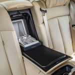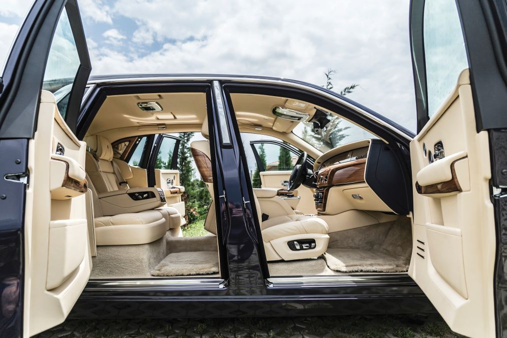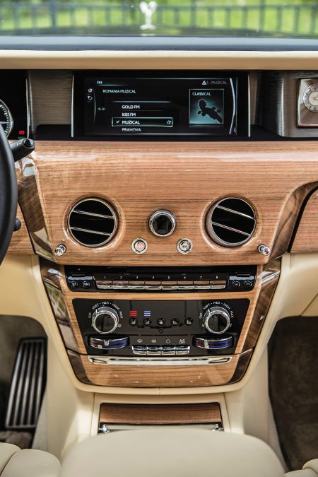 Caut plastic. Caut în zadar: până și buzunarele ușilor și stâlpii centrali sunt capitonați cu piele fină. Mai jos, covorașele sunt realizate din lână pufoasă de miel, iar eu îmi retrag instinctiv picioarele, într-un exces de bun simț. Pare-se, totuși, că așa e în lumea bună, așa că-mi pun din nou încălțările pe covoraș, aproape rușinat de reacția mea. O ultimă privire la bordul placat cu lemn masiv îmi dezvăluie un detaliu incredibil: în Phantom poți să-ți reglezi individual temperatura climatizării în funcție de zonă, pentru fiecare loc: de exemplu, doamnele care pot fi deranjate de aerul prea rece la picioare, pot să-l direcționeze pe sus, concomitent cu un flux de aer mai cald pe jos.