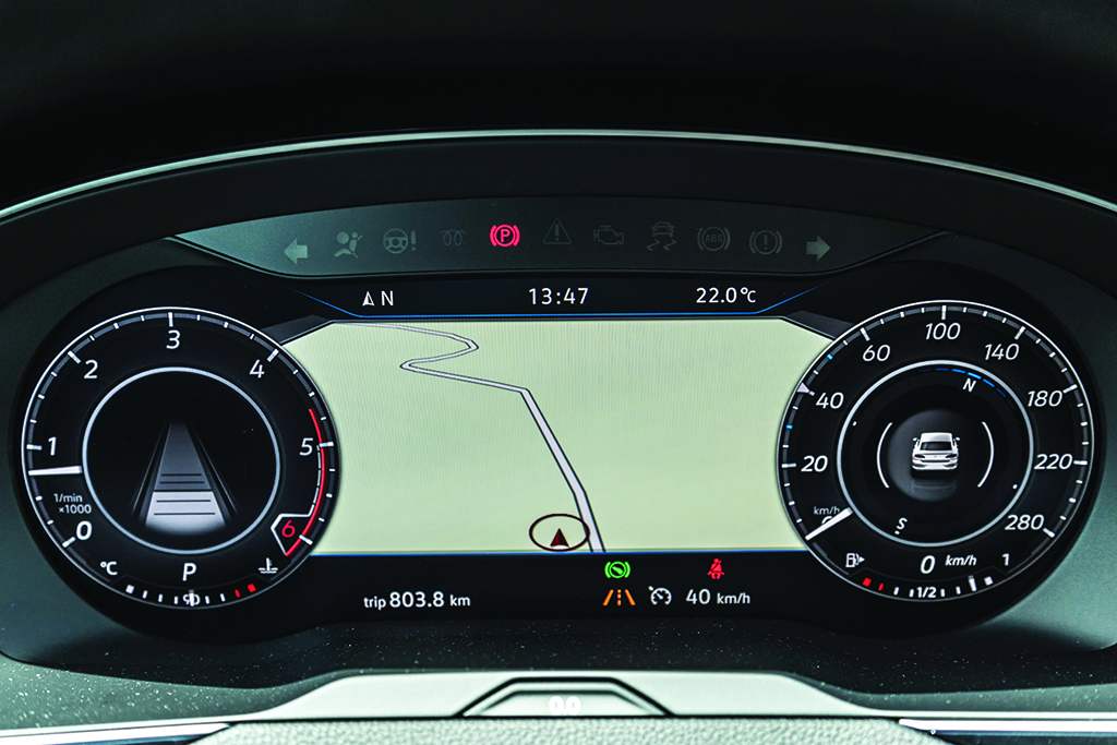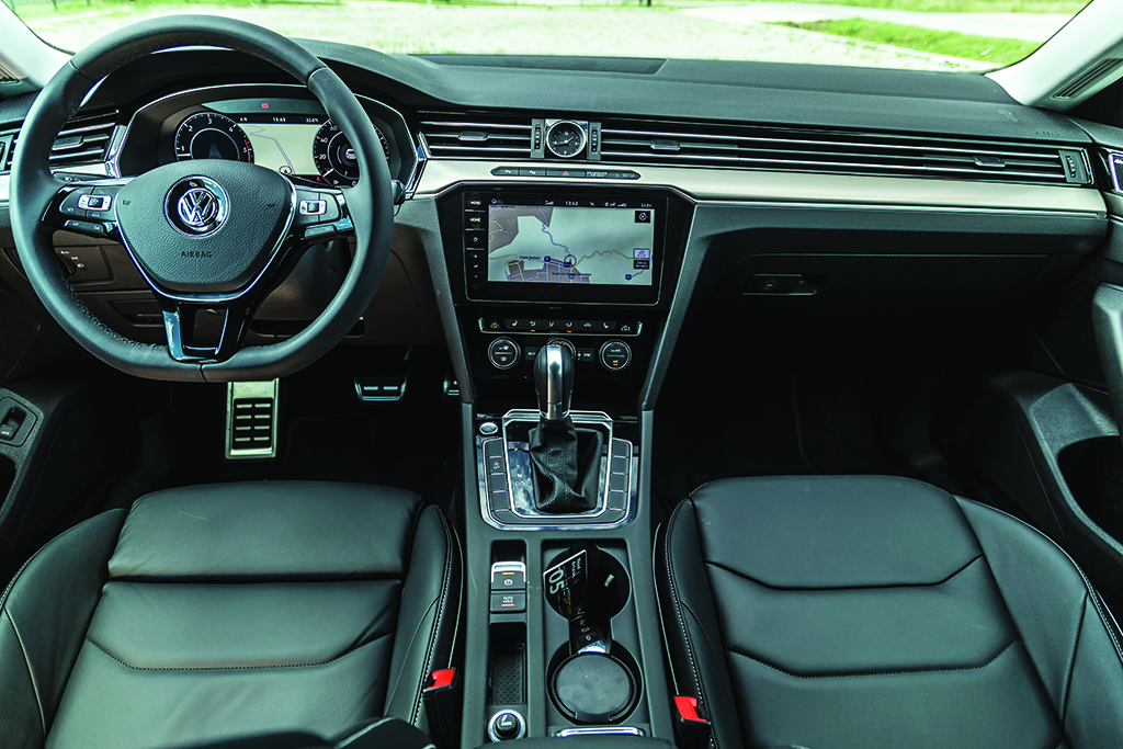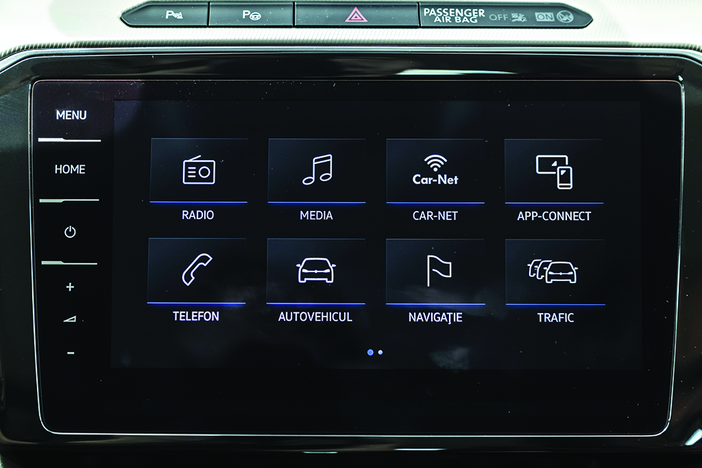 Poziția de condus este joasă și confortabilă la fel ca în Passat, modelul de test beneficiind de scaunul șoferului ergoComfort cu reglaje pe 14 direcții și masaj. Noul sistem multimedia Discover Pro de 9,2 inch (1.844 euro) este spectaculos cu ecranul său de 9,2 inch și fără niciun buton fizic. În detaliu nu e chiar perfect pentru că unele submeniuri nu sunt atât de intuitive pe cât ne așteptam iar butonul de volum cu + și – nu e practice. Ne salvează însă comanda volumului mult mai simplă de pe volan, iar dacă se comandă indicatoarele de bord virtuale (519 euro) ergonomia se îmbunătățește, putând accesa numeroase meniuri pe displayul virtual dintre indicatoare.