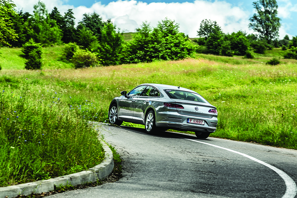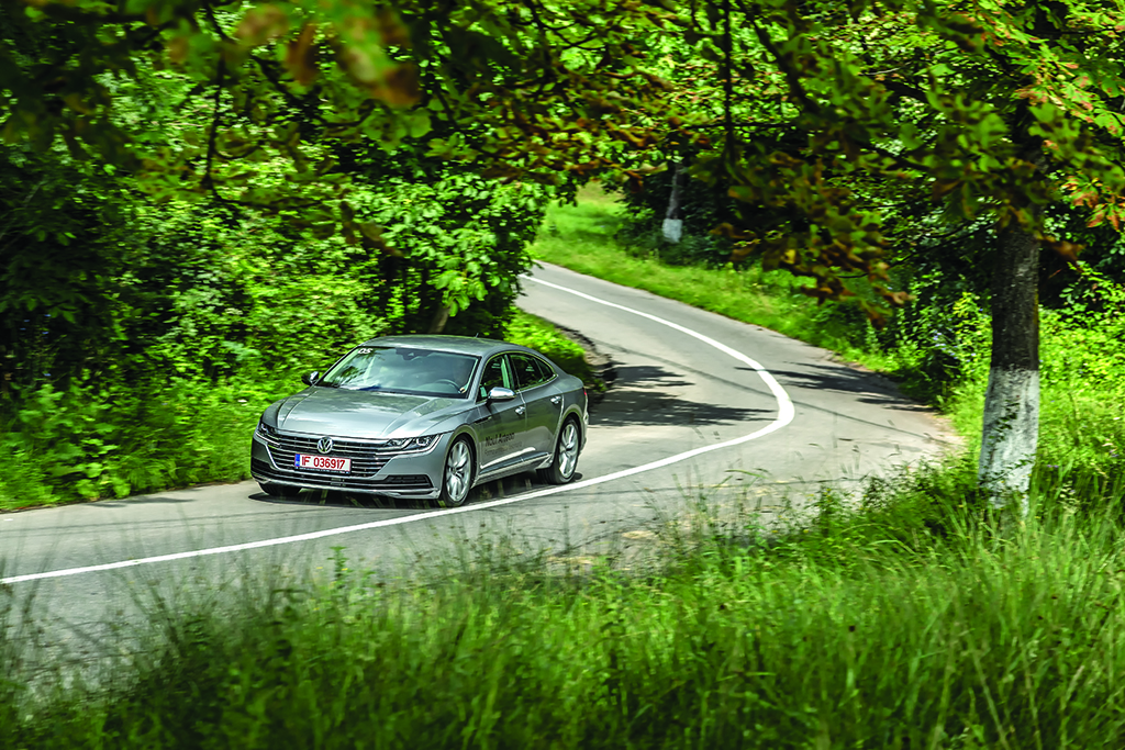Noi am condus versiunea 2.0 TDI 150 CP DSG care va fi probabil cea mai vândută versiune. La condus, Arteon se simte ca un Passat și acest lucru nu este o coincidență deoarece ambele modele utilizează aceeași platformă MQB cu punte spate independentă. Subiectiv, Arteon pare o idee mai confortabil datorită ampatamentului ceva mai mare în ciuda jantelor opționale de 19 inch cu talon îngust prezente pe mașina de test. Ca și la Passat, se oferă opțional suspensia adaptivă DCC (1.019 euro) dar aceasta nu era disponibilă pe mașina de test. VW declară însă că banda de reglaj a lui DCC este mai largă la Arteon în sensul că pe modul Comfort este mai soft decât Passat, iar pe modul Sport este mai fermă decât la Passat. Însă și cu suspensia standard, Arteon absoarbe excelent denivelările scurte și oferă un confort demn de clasa premium chiar încălțat cu jantele mai mari de 19 inch și pneurile de 245/40 R19 cu talon îngust (511 euro). Ne-a plăcut foarte mult și răspunsul direcției și faptul că efectul subvirator este mult redus. Diferențialul electronic XDS care simulează funcționarea unui diferențial blocabil reduce mult subvirarea pe față în ciuda unei distribuții a maselor preponderent pe față, tipică unei tracțiuni față. La condus, Arteon pare mult mai compact decât cei 4,86 metri pe care îi afișează, este agil iar ruliul în viraje este redus.