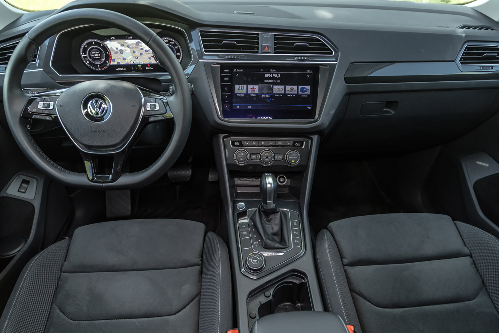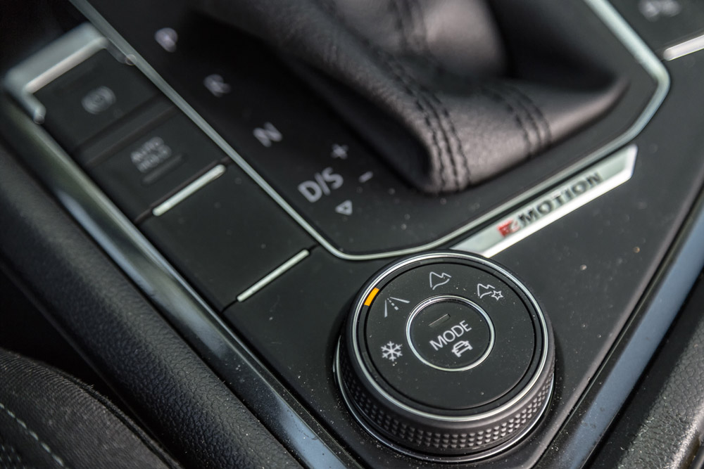 Chiar și cu jantele mari, la 130 km/h Tiguan se mulțumește cu puțin peste 7 l/100 km, iar motorul rulează relaxat cu 2.200 rpm. Scăderea vitezei până la 100 km/h coboară turația la 1.750 rpm și asigură un consum de 5,8 l/100 km. Șoferul primește un selector pe tunelul central, de la care poate alege unul dintre cele patru moduri de rulare principale: Snow, Normal, Offroad și Offroad Individual. În plus, în modul Normal, apăsând tasta Mode aflată în centrul selectorului, poate alege încă patru moduri adiționale: Eco, Normal, Sport și Individual, de la care poate seta diverși parametri de funcționare.