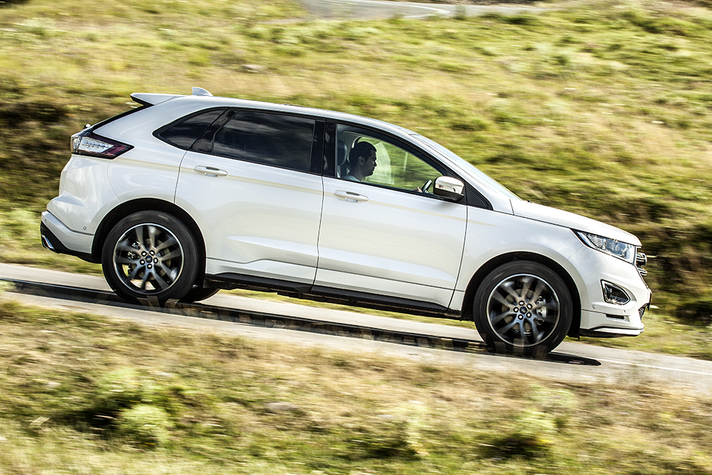 Drumurile puternic virajate de munte sunt cele care scot la iveală adevărata personalitate a lui Edge. Direcția cu raport de demultiplicare variabil (la viteze reduse sunt necesare mai puține ture ale volanului pentru un unghi egal de rotație al roților), configurabilă în două trepte (Sport și Comfort), este directă și plăcută. Marele SUV Ford reușește, astfel, să mimeze, viraj după viraj, emoțiile pe care numai un Focus le poate trezi, ruliul fiind, de asemenea, limitat. Deloc surprinzător, dacă ne gândim la sursa platformei tehnice folosită de Edge, monovolumul S-Max, respectiv limuzina Mondeo.