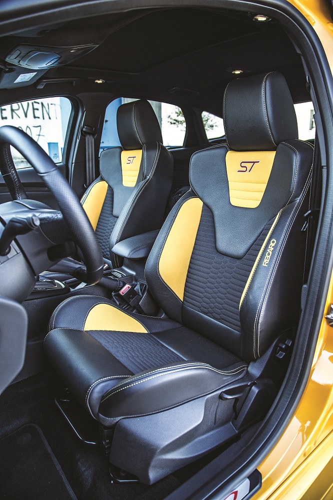 Celelalte elemente care amintesc șoferului că se află într-un Focus de rasă sunt simbolice și includ pedale, inserții de aluminiu lustruit și plăcuțe luminate în roșu pe praguri. Spațiul, identic cu cel oferit de surorile mai puțin versate, pare în antiteză cu performanțele dinamice: familiile cu patru membri se pot declara pe deplin mulțumite. Iar dacă nevoile cresc, Ford le propune și varianta break în echipare ST…nu de alta, dar poate plănuiți o vacanță alături de familie, cu 248 km/h.
