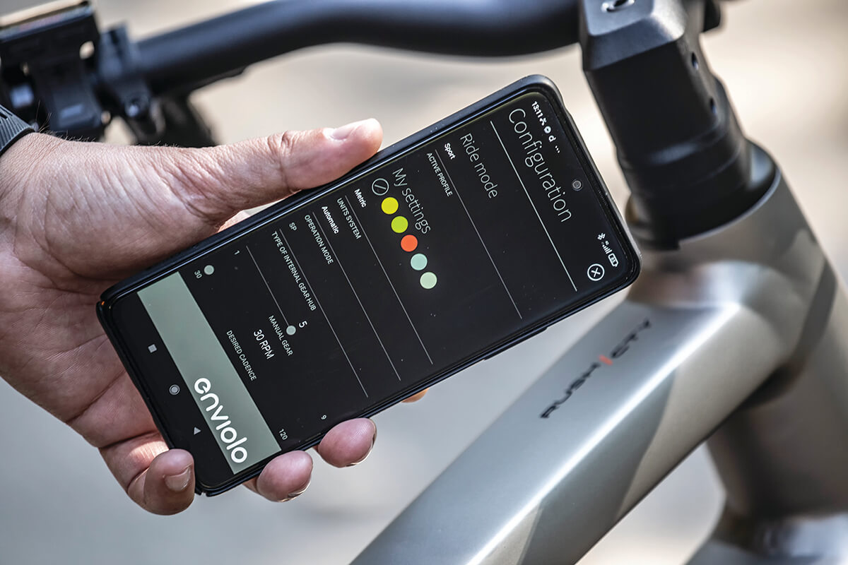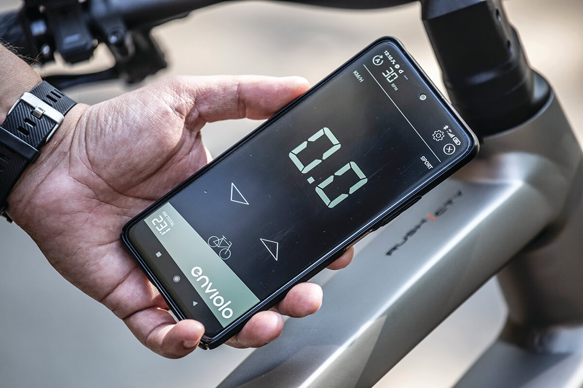 În afara acestora, nu poți selecta nimic de pe bicicletă. Doar pedalezi. Sigur, dacă descarci aplicația Enviolo de pe App Store sau Play Store, atunci ai acces și la reglajul cadenței pedalării. Poți selecta orice valoare între 30 și 120 rpm, iar transmisia CVT se ocupă de restul. Simplu spus, fie faci cardio, fie mergi normal, fie faci forță. Cadența aleasă se poate combina cu orice nivel de asistență. Adică, ai o mulțime de posibilități. O mulțime de moduri de a jongla cu parametrii.