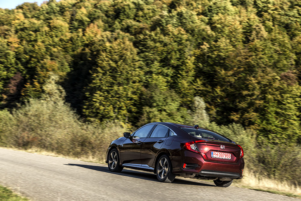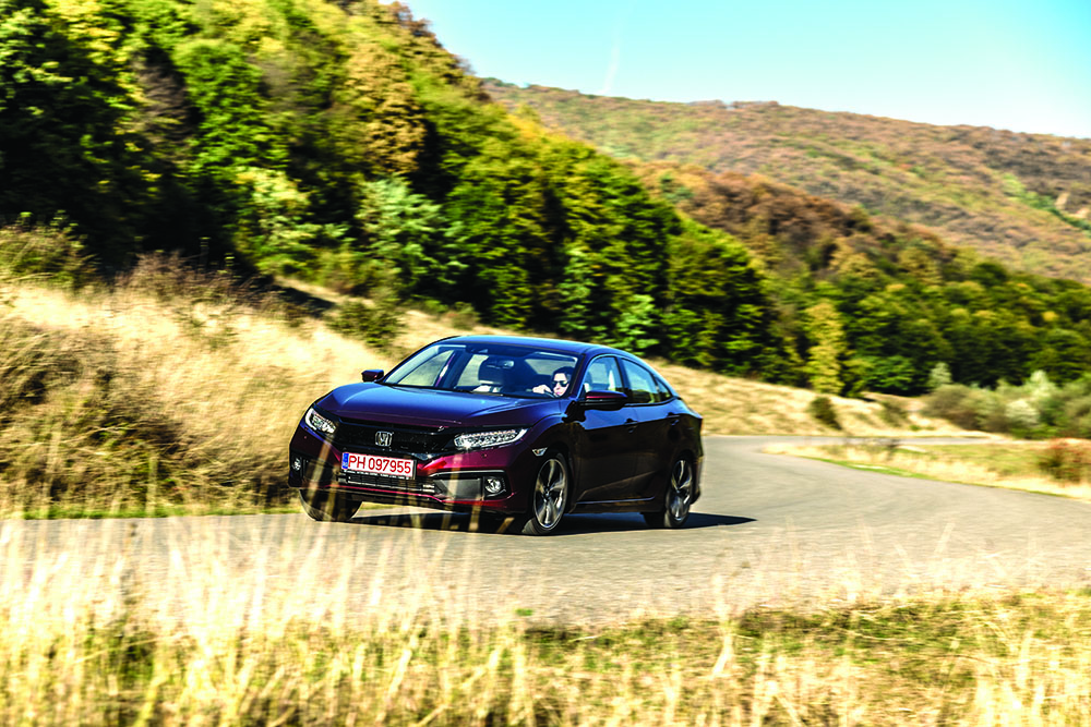 Recent, Honda Civic Sedan a primit un ușor facelift, care o ancorează și mai mult în zona premium a segmentului compactelor ”bine crescute”. În test, versiunea turbo de 1,5 l, combinată cu transmisia CVT. Foto: Bogdan Paraschiv
