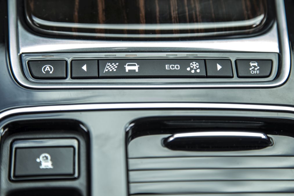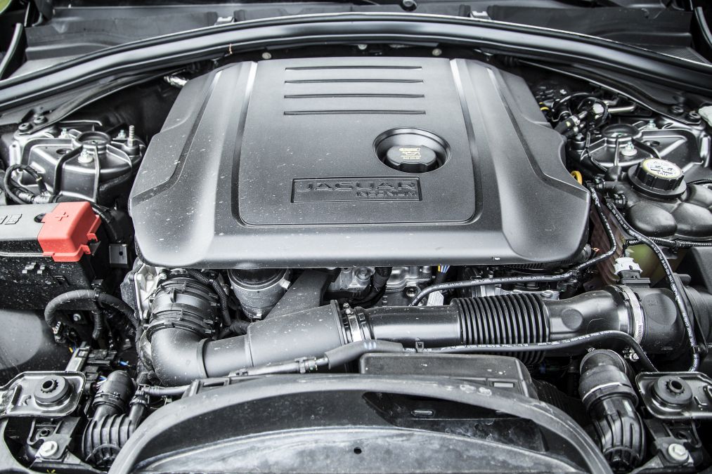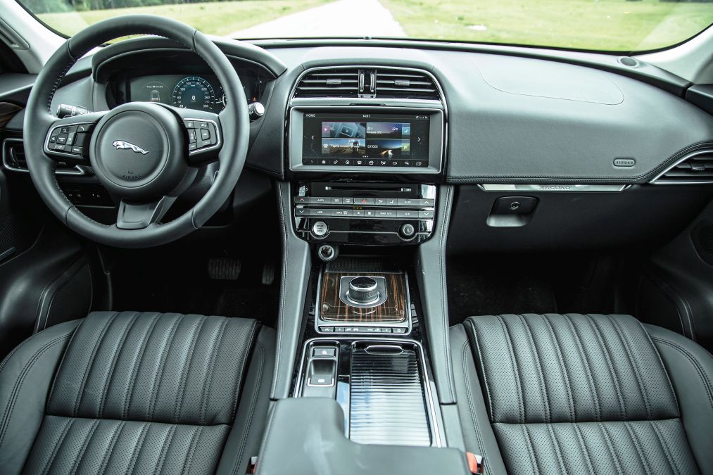 Volanul are un diametru relativ mic pentru o mașină din această clasă și face un unghi mic cu verticala în timp ce levierul schimbătorului cutiei automate cu 8 trepte a fost înlocuit cu butonul rotativ tradițional pentru marca britanică, care iese în afară la punerea contactului. Când se comandă sistemul multimedia de top InControl TouchPro, instrumentele de bord clasice sunt înlocuite de un display virtual de 12,3 inch care se poate configura în funcție de modul de condus ales în două feluri (unul pentru Dynamic și altul pentru Normal, Eco și Off-road) putându-se alege în fiecare caz patru teme diferite (Journey, Technical, Graphical și Minimal). În plus, se poate configura displayul instrumentelor de bord pentru afișarea pe o parte a ecranului sau pe tot ecranul a hărții de la navigație. Modul Off-road nu are însă semnificația de la Land Rover fiind gândit mai mult pentru deplasarea pe zăpadă, gheață și noroi decât pentru a te aventura în off-road dificil în ciuda unei gărzi la sol respectabile de 213 mm. De altfel, sistemul 4×4 este preluat de la sportivul F-Type. În condiții normale, puterea este direcționată aproape exclusiv spre roțile spate și doar la pierderea aderenței începe transferul de putere spre față. Jaguar se laudă că sistemul nu are nevoie decât de 165 milisecunde pentru a transfera puterea de la 0/100% față/spate la 50/50%.
