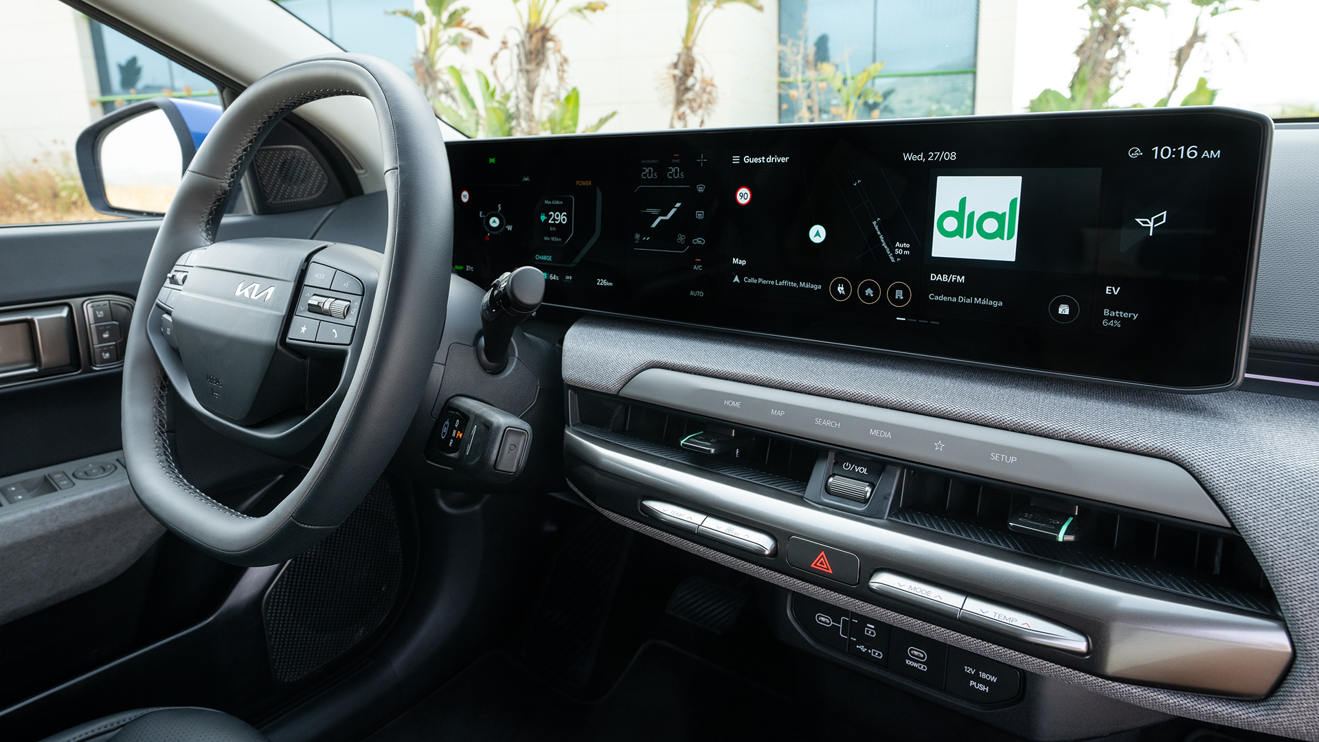Intru direct în pâine și-ți spun că poziția de conducere este evident mai joasă decât la EV3, și, deși scaunele sunt extrem de asemănătoare cu ale fratelui crossover, e mult mai incitant să te simți mai apropiat de șosea. Patru centimetri reprezintă o diferență mare între înălțimea pozițiilor de conducere ale celor două modele. Iar aceasta se păstrează nu numai când o raportezi la șosea, ci și la podea. Astfel, gambele sunt mai întinse și te simți mai pregătit să ataci virajele în forță. Aceleași trei ecrane plasate sub un singur panou, două de 12,3 inchi și unul de 5, cu grafică bună și rezoluție excelentă, aflate pe cele mai recente modele ale familiei EV, îți țin companie și la EV4. Și aici, că să vezi display-ul climatizării trebuie să înclini capul în dreapta, pentru că volanul îl maschează.