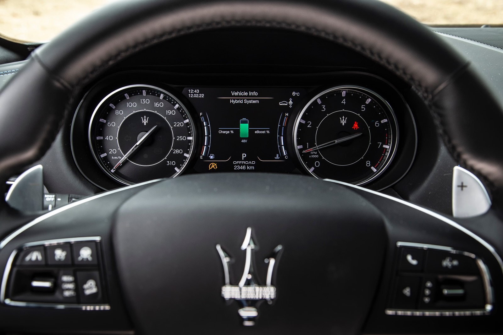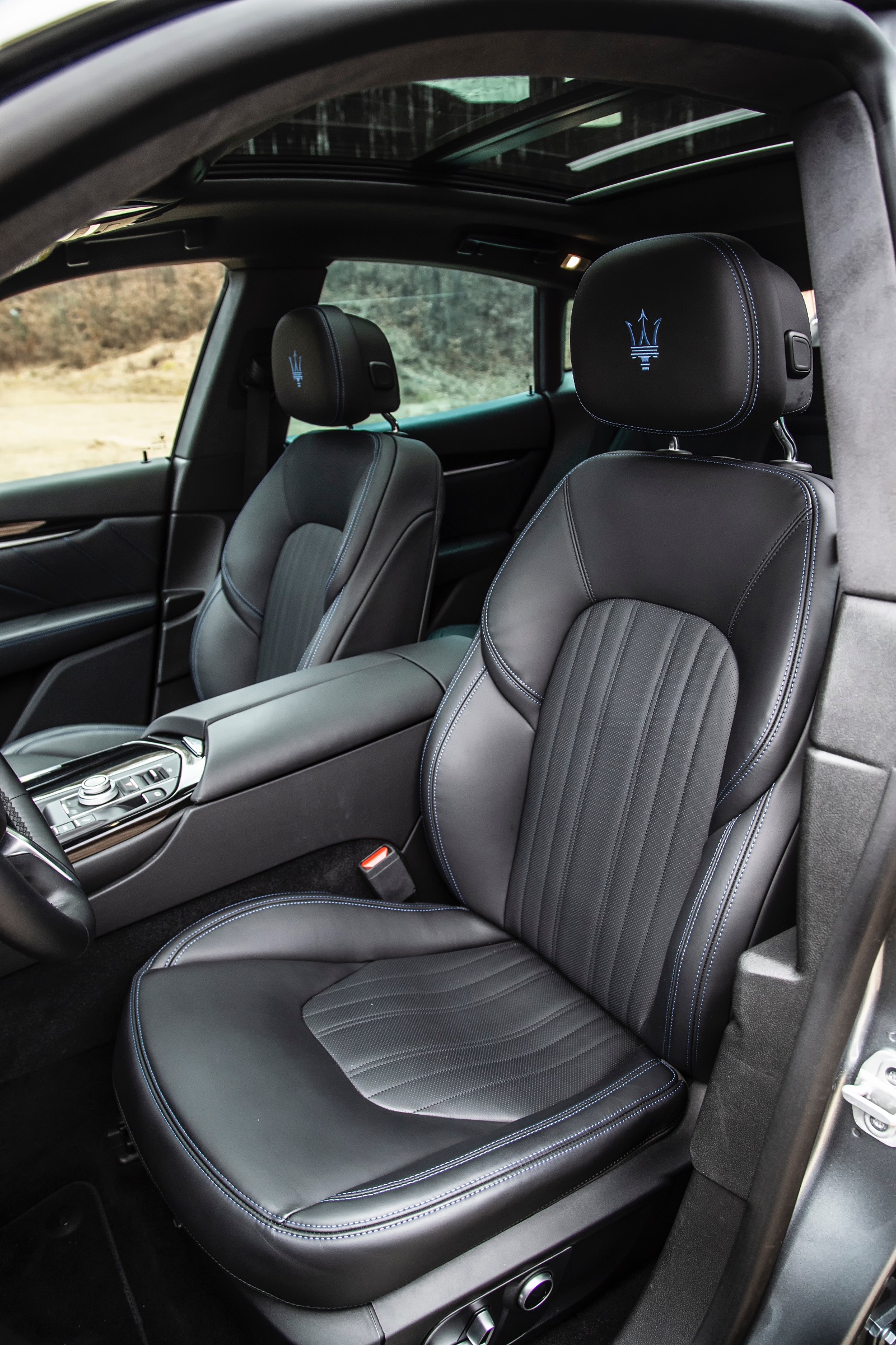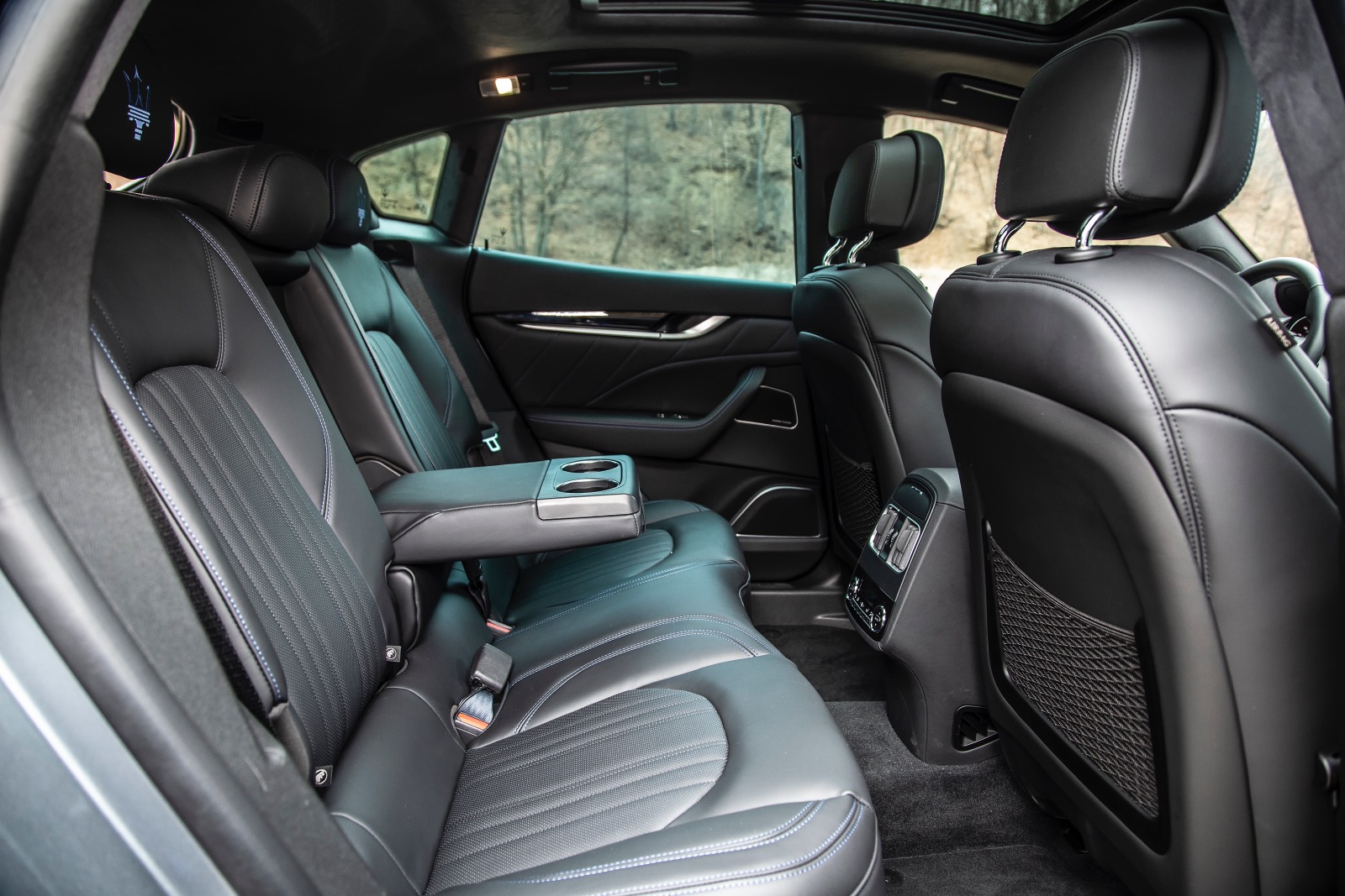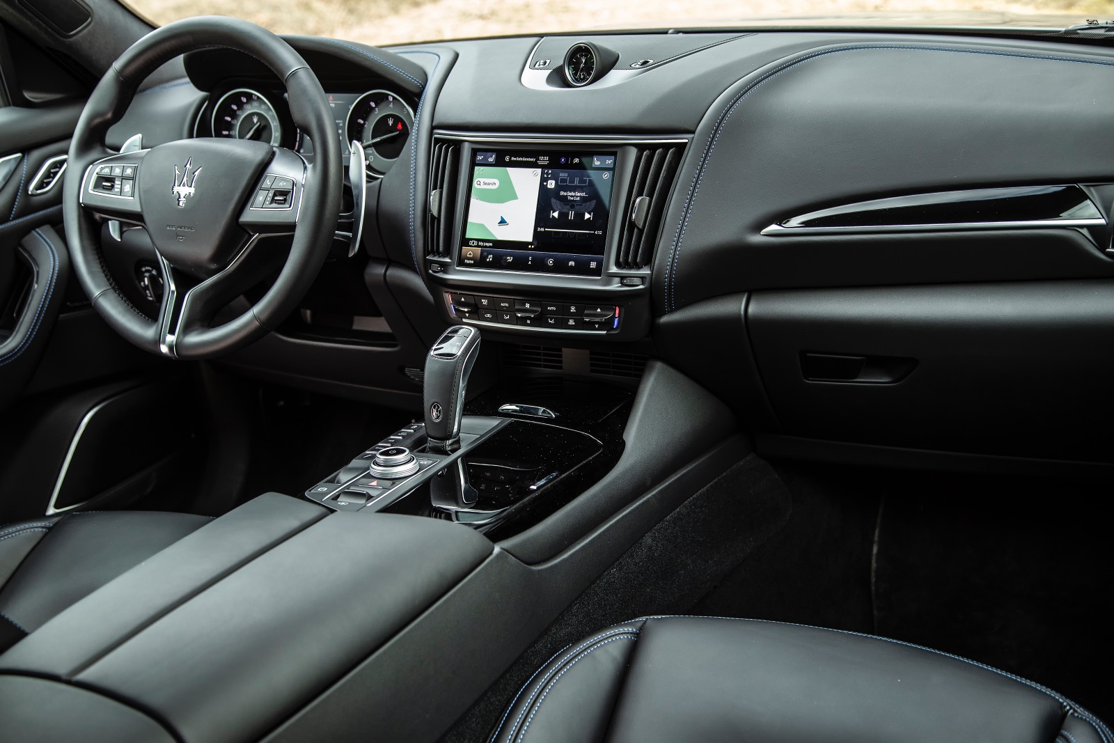 În habitaclu, nu poți să nu remarci scaunele ample și confortabile, materialele de calitate, finisările bune (dar și mult plastic piano black), chiar dacă poate nu sunt la nivelul celor oferite de concurența germană. Tapițeria de piele are cusături albastre, iar pe tetieră, tridentul mărcii este brodat tot cu albastru. Sunt elemente specifice hibridului, care nu se regăsesc la celelalte versiuni ale modelului Levante. Tema elementelor de culoare albastră se regăsește și la exterior, sub forma unei serii de inserții discrete la nivelul celor trei prize de aer laterale. Un alt element specific sunt etrierele sistemului de frânare vopsite în același albastru.