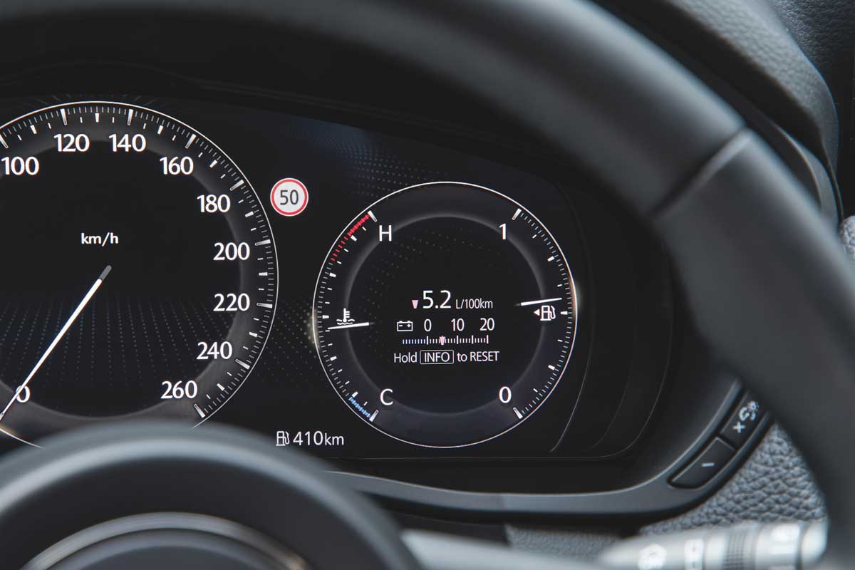 Cât consumă? Prea puțin pentru cât de mare este și cât de convingător accelerează. La mers legal, pe un traseu format din autostradă și drum național, 6 l/100 km sunt suficienți. Dacă ești dispus să nu accelerezi puternic, poți scădea și la 5,5. Iar dacă vrei să te distrezi, consumi cam 8 l/100 km. Ce contează cu adevărat e să-l lași în Normal, iar softul va ști să oprească motorul când eliberezi accelerația (coasting) și să-l țină între 1000 și 2000 rpm, alimentându-l cu amestec sărac, așa cum numai Mazda știe. Și apropo de asta, la 130 km/h într-a opta, turația stă aproape de 2000 rpm.