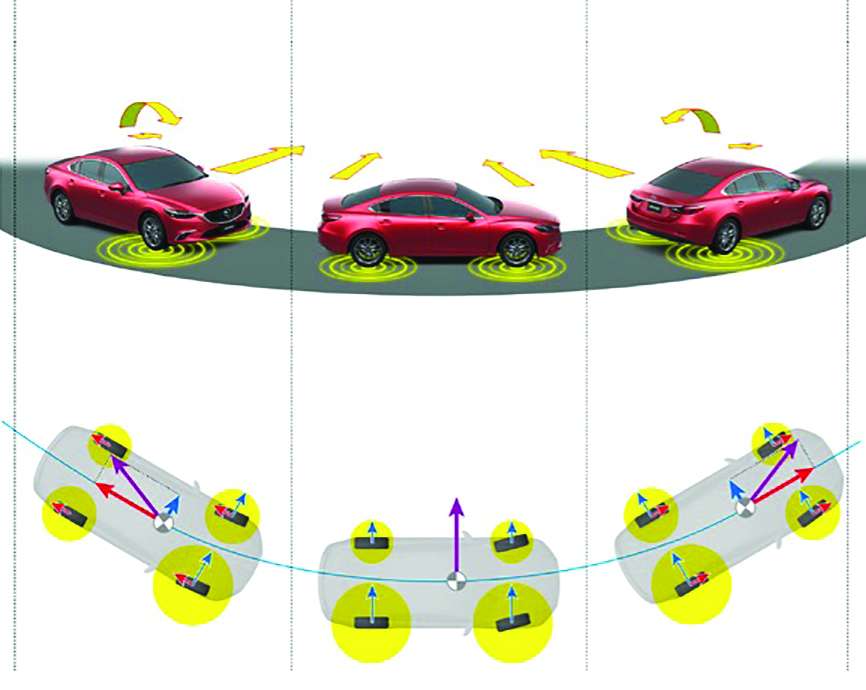 Test Mazda 6Sistemul G-Vectoring este complet electronic și citește poziția volanului la fiecare cinci milisecunde, limitând în funcție de aceasta cuplul motorului cu până la 30 Nm (în mod uzual cu 10 Nm). Efectul este imperceptibil din interior și constă într-o decelerare insesizabilă, de maximum 0,01 g, fără a acționa frânele, deci fără a transmite forțe în volan. Astfel, la înscrierea pe viraj, puntea față se încarcă suficient pentru a-și crește aderența, masa fiind transferată spre puntea spate la ieșirea din viraj. Transferul de mase se desfășoară lin și face ca tensiunea la nivelul mușchilor gâtului ocupanților să scadă, ridicând gradul de confort.