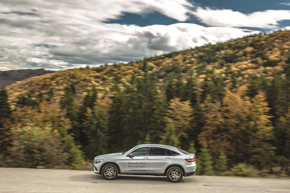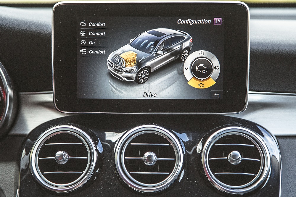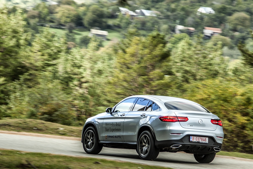 Oricum, selectorul Dynamic Select pentru modurile de rulare este standard și poate modifica răspunsul cutiei, al direcției și al suspensiei dacă se comandă cele două suspensii opționale. GLC Coupe se simte la fel de confortabil ca și GLC, dar este mai incisiv. Una din explicații este direcția cu raport de demultiplicare mai scurt de 15,1:1 față de 16,1:1 la GLC. Mai ales pe modurile Sport și Sport+ GLC Coupe este foarte angajant și incitant la condus. Centrul de greutate puțin mai coborât decât la GLC și direcția mai scurtă ca și suspensia sport sunt ingredientele principale în obținerea acestei ținute de drum incisive fără a ruina însă confortul. Sistemul de tracțiune integrală direcționează cuplul în raportul 45-55% față/spate în condiții normale, dar poate varia funcție de aderență. La limită, GLC Coupe împinge ușor și previzibil pe roțile din față, în câteva milisecunde o parte din cuplu fiind transferat spre spate pentru a diminua efectul subvirator.