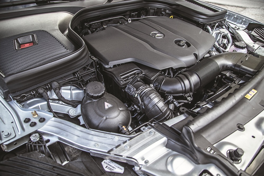 Motorul versiunii de test a fost dieselul de top cu 4 cilindri care livrează 204 CP la o cilindree de 2,1 litri. Cu sistem bi-turbo, trage foarte bine de jos și ca impresie subiectivă pare mai silențios decât fratele său de 170 CP. Cuplul omnipotent de 500 Nm este disponibil încă de la 1.600 rpm, iar cutia automată cu nouă trepte se armonizează foarte bine cu motorul și funcționează net mai fluent decât cea cu șapte trepte din trecut. Plaja mai largă de demultiplicare este benefică și pentru eficiență, contribuind la obținerea unui consum redus. Mercedes-Benz declară un consum de 5 l/100 km, însă în practică noi am obținut o valoare reală de 7,6 l/100 km. Ținând cont de masa mașinii la gol de 1.845 kg și de prezența cutiei automate și a tracțiunii integrale, rezultatul este meritoriu.
