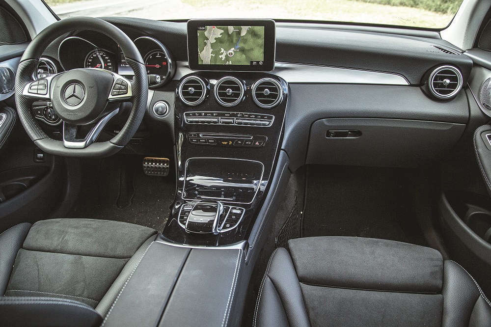 Interiorul de înaltă calitate este preluat de la GLC la fel ca și configurarea. Mașina de test era echipată cu centrala Comand Online cu display de 8,4 inch (3.108 euro), standard fiind oferit sistemul Audio 20 CD cu display de 7 inch.