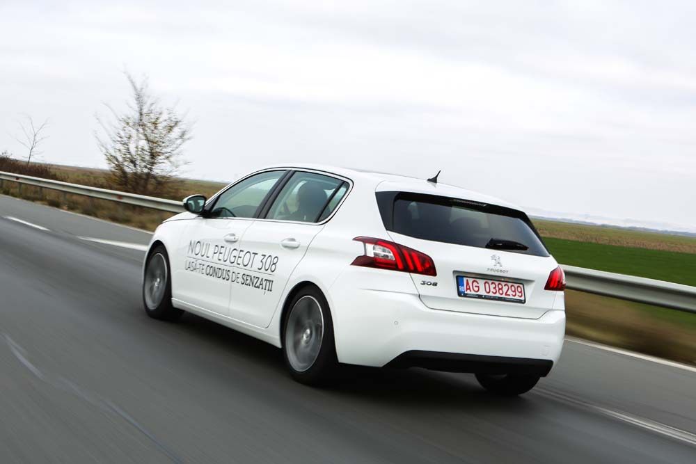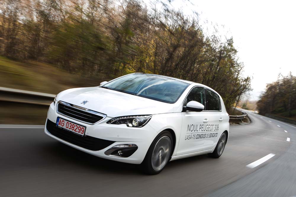 Deşi personal as înclina către o motorizare pe benzină, acest diesel s-a dovedit foarte silenţios şi, datorită greutăţii reduse, foarte vioi chiar şi la viteze de autostradă. Odată ce acul turometrului trece de 2.000 rpm, cuplul de 270 Nm împinge decent şi îşi păstrează suflul până la aproape 5.000 rpm. Cutia de viteze manuală are o timonerie îmbunătăţită, iar etajarea lungă favorizează consumul de carburant care, în cazul nostru, a fost puţin peste 5 litri pentru fiecare 100 de km parcurşi în regim mixt. Pe autostradă, izolarea este ireprosabilă, iar setarea direcţiei şi a suspensiei îl recomandă pentru astfel de drumuri. Situaţia se precipită când în peisaj apar primele viraje, poziţia şoferului“pe volan” anesteziind placerea de a conduce, la fel ca suspensia care induce o anumită misca relongitudinală. Odată ce am trecut de primul prag al mişcărilor de ruliu şi tangaj, acestea incep să comunice mai bine ce se întămplă pe carosabil, asigurând astfel un bun control la limită. Aşa cum scriam şi la începutul articolului, noul 308 este mai mult decât un exerciţiu de design, este un model care stabileşte noi standarde în segment şi o alternativă interesantă la maşinile uniformă!
