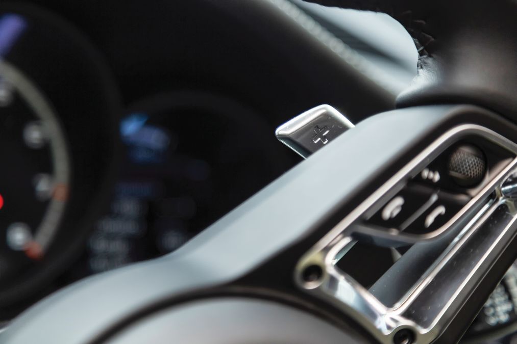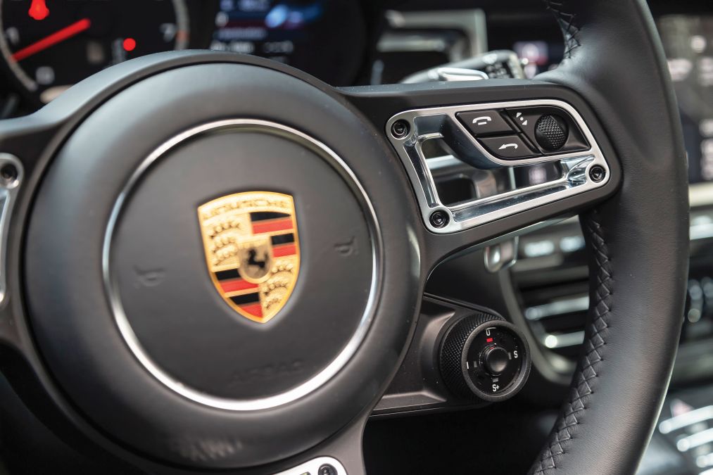 Volanul este identic cu cel pe care îl găsești în cea mai nouă generație a modelului Porsche 911, iar selectorul pentru modurile de condus este amplasat pe volan.