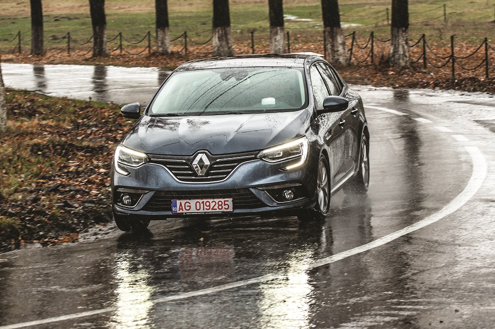Diametrul de bracaj este mai bun în cazul modelului german, iar acest lucru se simte la parcările în spații strâmte și la întoarcerile din trei mișcări. Pentru a roti volanul, însă, Jetta cere o mână mai hotărâtă, de aceea francezul primește puncte pentru forța scăzută cu care se manevrează volanul în circulația urbană. Odată intrat pe drumuri naționale, balanța se schimbă puternic: Jetta este clar mai stabilă și agilă pe viraje, frânele sunt mai puternice, iar direcția este mai adaptată unui stil sportiv. Pe serpentine, modelul german desenează virajele mai exact, oferind în același timp un feedback ameliorat al șoselei, în timp ce Megane nu are aceeași precizie.