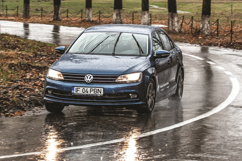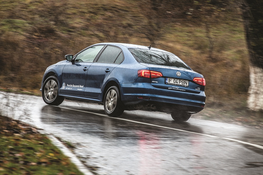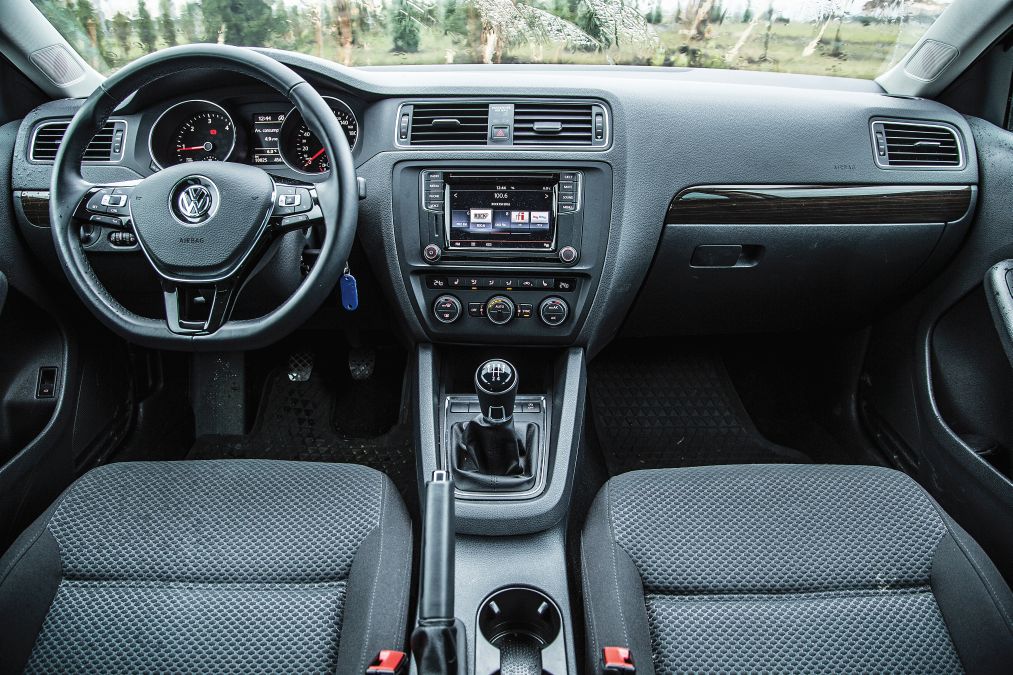 Situația se menține asemănătoare și în habitaclu: Jetta ne întâmpină cu un interior ergonomic, dar conformist. Toate comenzile sunt la locul lor, așa că nu pierzi vremea căutând încălzirea în scaune sau butoanele instalației de sunet. Practic, după doar câteva minute petrecute la bord, ești complet familiarizat cu toate comenzile, fapt care ușurează mult viața la volan și permite șoferului să se concentreze la drum, în loc să bâjbâie în căutarea unor comenzi ascunse. Am apreciat din plin decizia nemților de a păstra butoanele rotative, atât de prietenoase în utilizare, în locul iconițelor virtuale. Cu atât mai mult cu cât asta nu-l transformă într-un autoturism arhaic: sistemul de infotainment, similar cu ale celor mai noi modele VW se conectează rapid la telefonul mobil și este intuitiv la navigarea prin meniuri. În plus, comenzile de pe ecranul tactil sunt dublate de tastele aflate pe lateralele acestuia, ușurând operarea.