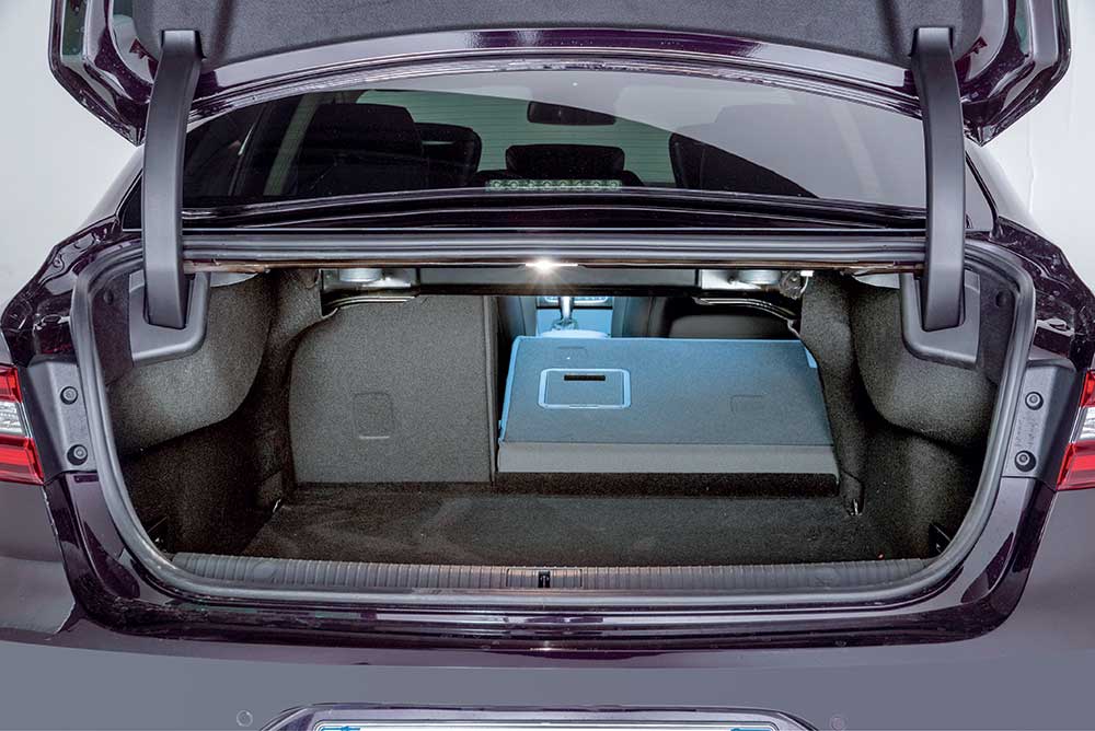Dacă oferta de spațiu transcede în segmentul superior, portbagajul nu impune noi standarde în clasă. Conform măsurătorilor Quattroruote acesta oferă un volum de 498 litri (oficial, 515 litri). Bancheta este rabatabilă și poate fi divizată standard în format 1/3-2/3, coborârea cotierei eliberând o fantă dedicată depozitării schiurilor, evident cu condiția renunțării la locul posterior central. Astfel de aspecte de natură practică, în detrimentul eleganței, nu sunt, până la urmă, prioritare pentru o limuzină – pentru familiști Renault are o soluție dedicată: Talisman Estate.