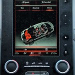 dimensiunilor sale exterioare situate la granița dintre clasa medie și cea mare: lungime de 4,85 m, lăţime de 1,87 m, înălţime de 1,46 m și ampatament de 2,81 m. Pășind la interior, discuția migrează către o altă unitate de măsură: inch. Mai precis, cei 8,7 inch ai „tabletei” R-Link 2 ce ocupă întreaga consolă centrală. Da, am mai văzut sisteme de infotainment cu ecrane tactile de dimensiuni apreciabile, dar soluția dispunerii verticale, în format portrait (cu home screen-ul personalizabil, divizat în mod uzual între hărțile sistemului de navigație și setările radioului), trezește paralele flatante cu fratele mai mare Espace și, inevitabil, cu Tesla, fiind realmente impresionantă. Pentru conservatori, pe tunelul median se regăsește, de asemenea, un controller rotativ ce dublează comenzile touch și amintește de referința în domeniu, celebrul iDrive de la BMW.