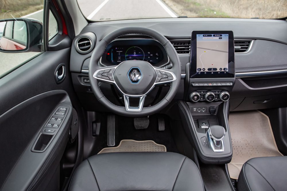Interiorul este, însă, complet nou și seamănă leit cu cele de pe Clio și Captur. Același sistem EasyLink cu display tactil de 9,3 inci (500 euro împreună cu navi și sunet Bose, standard vine cu display de 7 inci) și instrumentarul digital de 10 inci (care urmează să apară pe suorile convenționale) fac o impresie premium, în ton cu caracterul digitalizat și electrificat al lui ZOE. Pot să-mi comand și tapițerie din piele (1.000 euro), cu prețul renunțării la tapițeria standard, confecționată 100% din materiale reciclate. Apropo de materiale, cele de pe bord sunt în mare progres față de precedenta generație și ating nivelul celor de la Clio, însă fețele de uși și-au păstrat plasticul tare pe toată suprafața, mai puțin pe cotierele capitonate. A, și nu pot să-mi comand cotieră centrală, nici în față, nici în spate.