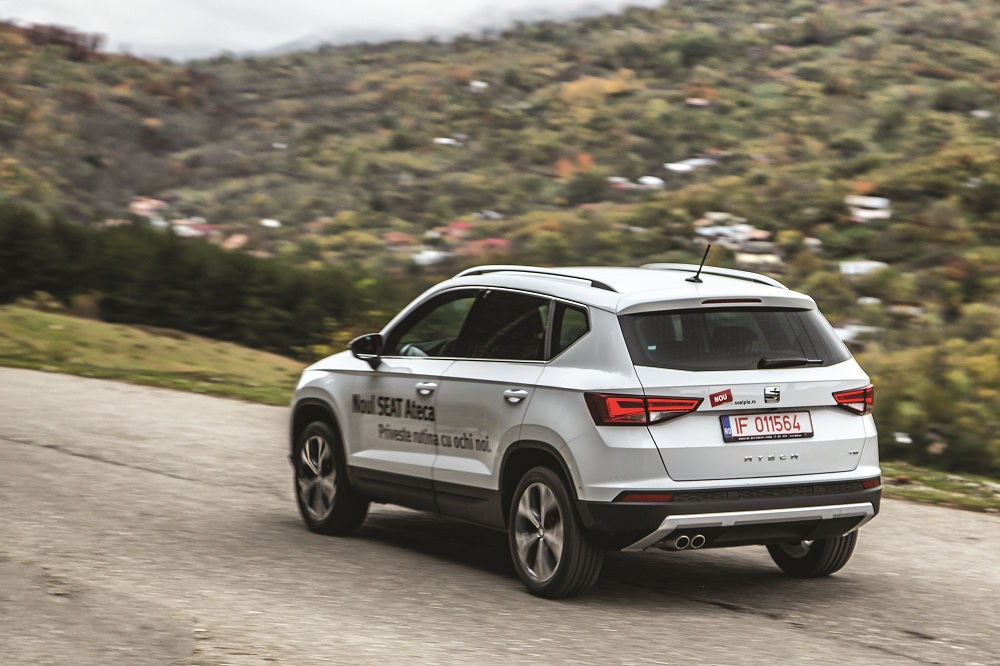 Am părăsit deci repede jungla urbană pentru ședința foto, iar consumul extraurban s-a stabilizat la valoarea ceva mai liniștitoare de 6,5 l/100 km. Este rezultatul direct al dezactivării a doi cilindri la viteză constantă, în sarcină redusă, atunci când cerințele de cuplu sunt scăzute. Sigur, nici acest șiretlic nu egalează valorile de consum ale motorului diesel de 2 litri (pe a cărui dinamică o copiază aproape la indigo în fișa tehnică), dar faptul că este mult mai silențios și mai rafinat îl recomandă celor care parcurg mai puțini kilometri la volan. Și, în fond, o călătorie nu este definită doar prin eficiență, ci trebuie picantată cu un pic de sportivitate, pe care Ateca nu se sfiește s-o afișeze de fiecare dată când i se dă ocazia.