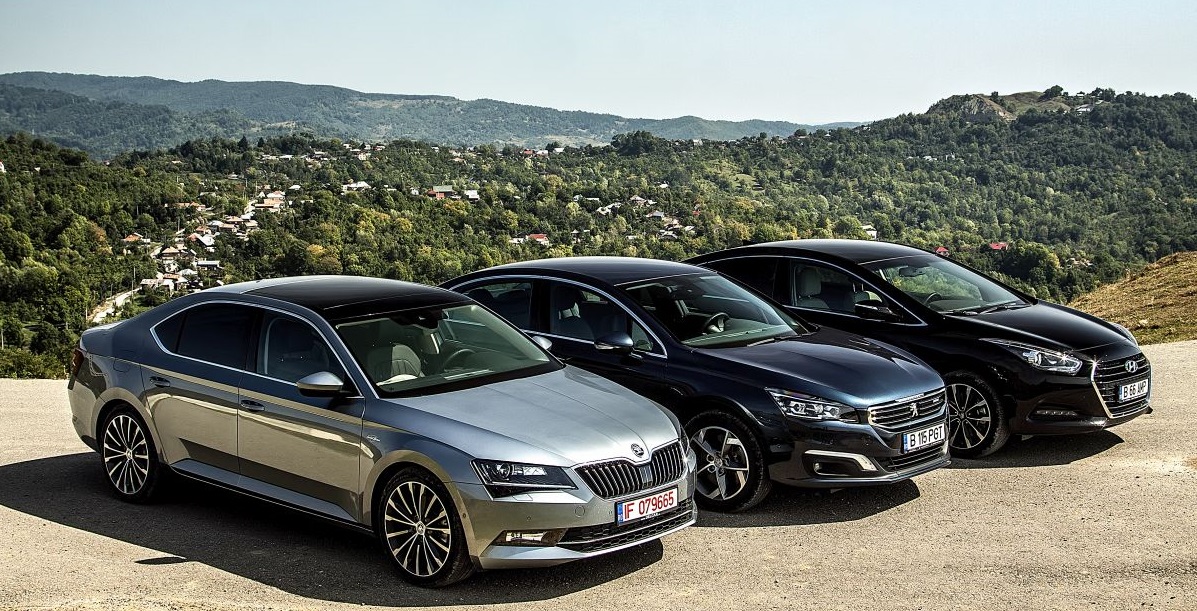 În testul nostru se înfruntă versiunile diesel combinate cu transmisii automate în echipările de lux: Škoda Superb cu turbodieselul de 2 litri și 190 CP și cutie automată cu dublu ambreiaj cu 6 trepte în echiparea Laurin & Klement, Peugeot 508 cu turbodieselul de 2 litri și 180 CP combinat cu transmisie automată clasică cu 6 trepte în echiparea Allure și Hyundai i40 facelift cu turbodieselul de 1,7 litri cu putere crescută de la 136 la 141 CP combinat cu noua cutie automată cu dublu ambreiaj DCT7 în echiparea de top Supreme.