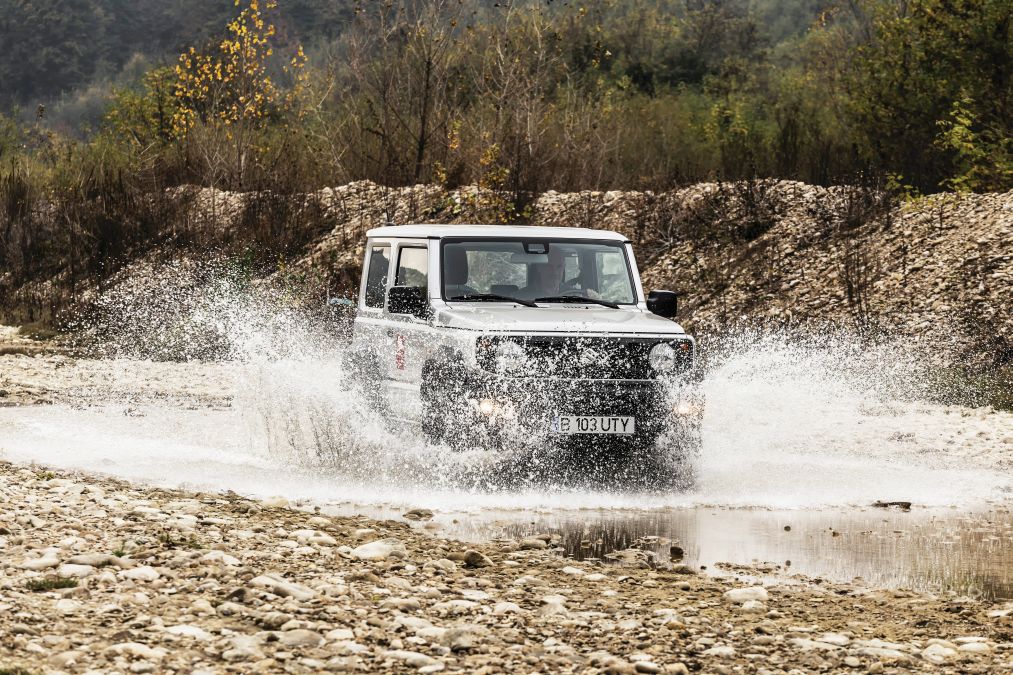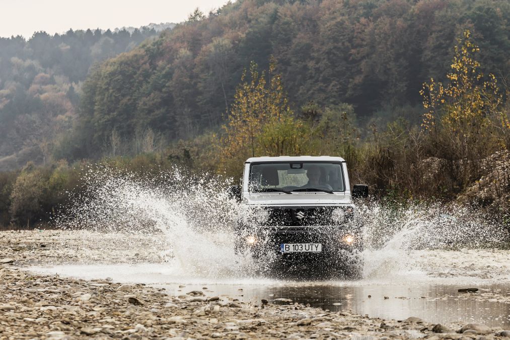 Însă Jimny nu e mașină de autostradă și hai să vorbim puțin și de ce știe mai bine să facă în off-road. Garda la sol de 210 mm este foarte practică și în realitate pare mai mare pentru că nu există elemente de suspensie sau de transmisie amplasate mai aproape de sol. Iar roțile sunt plasate în colțurile caroseriei și astfel consolele față/spate sunt extrem de scurte.
