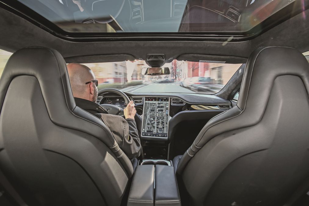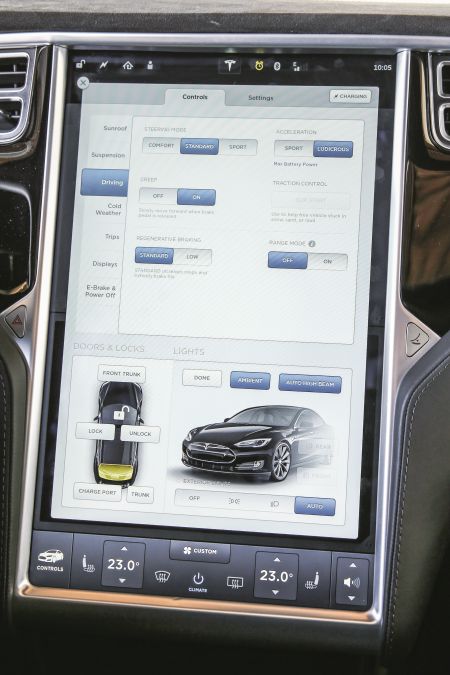 Piesa centrală a planșei de bord este un uriaș display de 17 inch în poziție portret, care nu este utilizat doar ca afișaj pentru sistemul multimedia ci a înlocuit aproape toate comenzile și butoanele clasice cu comenzi tactile. Chiar și reglajul temperaturii, încălzirea scaunelor, deschiderea portbagajului și reglajul gărzii la sol se activează tot de pe uriașa tabletă. Deși ecranul tactil rămâne principalul punct de atracție, nu putem să nu remarcăm interiorul foarte bine realizat cu materiale de bună calitate, comparabile cu ale rivalilor germani premium. Însă nu trebuie să uităm că acest model sare de 100.000 de euro, ceea ce nu este deloc puțin.