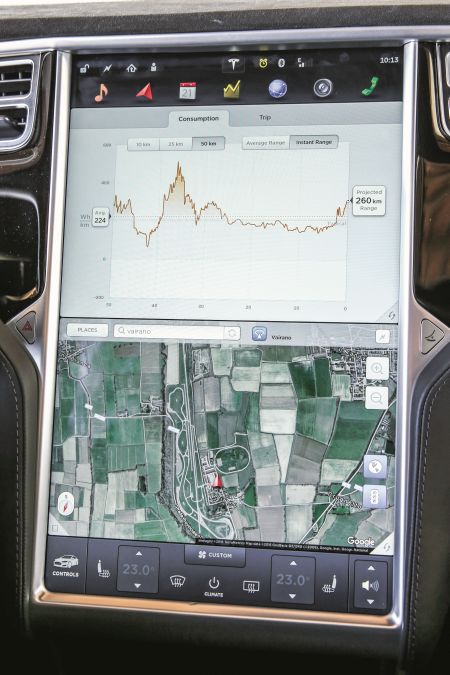 Într-o mașină electrică din ziua de azi autonomia nu depășeste 200 km în mod real. Însă Tesla Model S este excepția pentru că poate parcurge peste 350 km între două încărcări ale bateriei. Astfel, Model S nu suferă de fenomenul de anxietate a autonomiei de la alte modele electrice. Poți să ajungi de la București și la mare și la munte fără nicio problemă. Iar în unele din parcările magazinelor Kaufland se găsesc stații de încărcare de curent continuu de 50 kWh. Din păcate, nu au ajuns încă la noi stațiile Supercharger de 120 kWh construite de Tesla, dar nu se știe ce va fi în viitor. Cea mai apropiată stație este în Slovacia, iar pe străzile României circulă deja 20 Tesla Model S. Pe lângă autonomia remarcabilă, este greu să îți imaginezi alte posibilități de îmbunătățire a sistemului de propulsie.