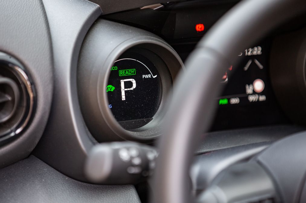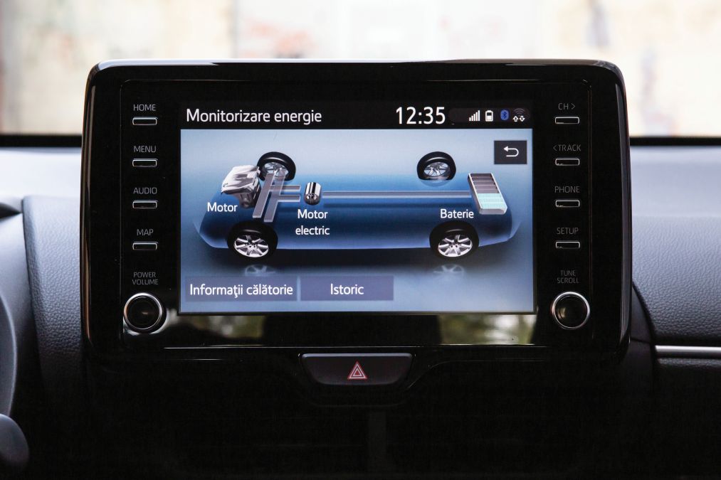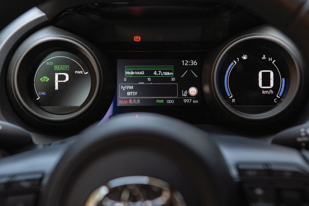 Fiecare strop de energie stors din benzină vine la pachet cu pulsul crescut cu 10 bătăi pe minut – în modul Power, sistemul hibrid nu mai are nicio legătură cu precedentul. Trage entuziasmant, secondat de transmisia CVT evident mai bine reglată, fără efect de bandă elastică, totul pe fondul unui sunet sportiv venit de la aspiratul în trei cilindri.