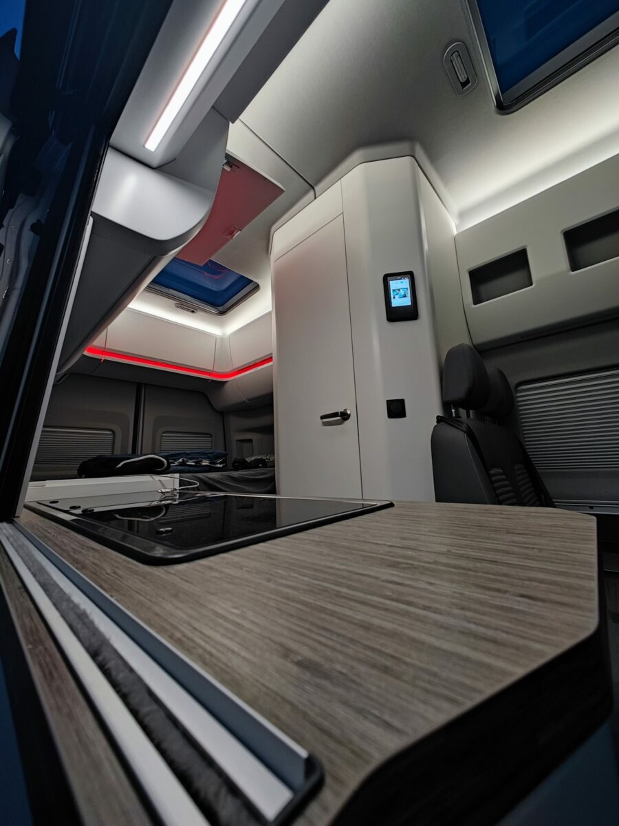 Tot de pe acest panou poți aprinde luminile separat, poți regla culoarea luminilor ambientale (disponibile în pachetul Dune, de 5926 euro) și poți porni și opri frigiderul, reglându-i temperatura sau punându-l în mod silențios, ca să nu te deranjeze noaptea. În sfârșit, poți activa modul Camper, care lasă trapa ușii laterale coborâtă și când e închisă ușa. Peste ror prin living vei descoperi mufe USB și comutatoare de lumini, și există și două prize de 220 V, una sub băncuță, cealaltă în portbagaj. Absolut toate geamurile au plase de țânțari și jaluzele, ușa glisantă are plasă de țânțari, iar parbrizul și geamurile laterale din față pot fi acoperite pe interior cu parasolare care se extind și se strâng fără efort.