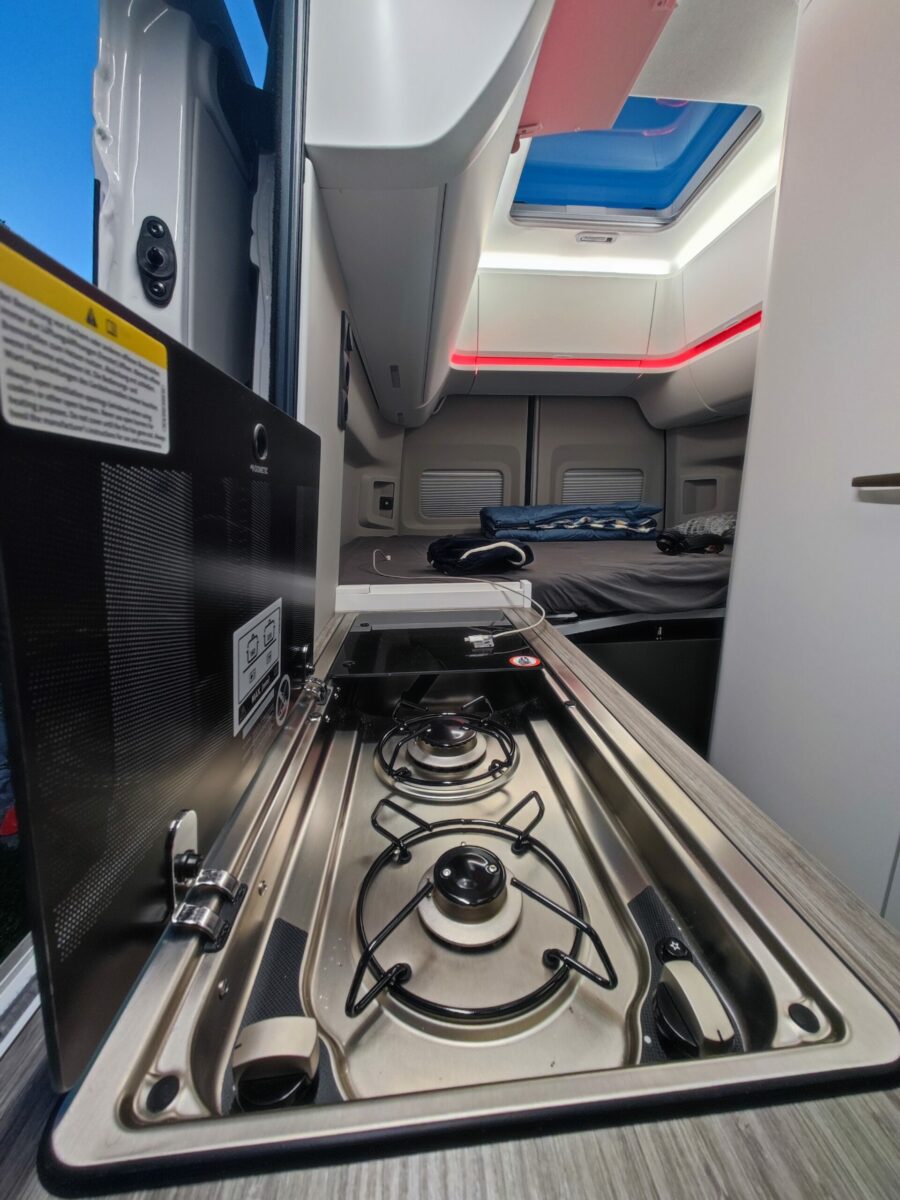 Ansamblul mobilierului de bucătărie „mușcă” puțin din deschiderea ușii laterale, cu scopul clar de a-ți aduce sertarul glisant al frigiderului de 70 litri „la botu’ calului”. Astfel, n-o să faci niciun efort când te arde buza să bei o bere, indiferent dacă ești afară sau în living. În spatele frigiderului se află aragazul cu două ochiuri, apoi chiuveta, a cărei baterie se pliază, intrând complet în interiorul cuvei. Când nu sunt folosite, ambele sunt acoperite cu capace din sticlă.
