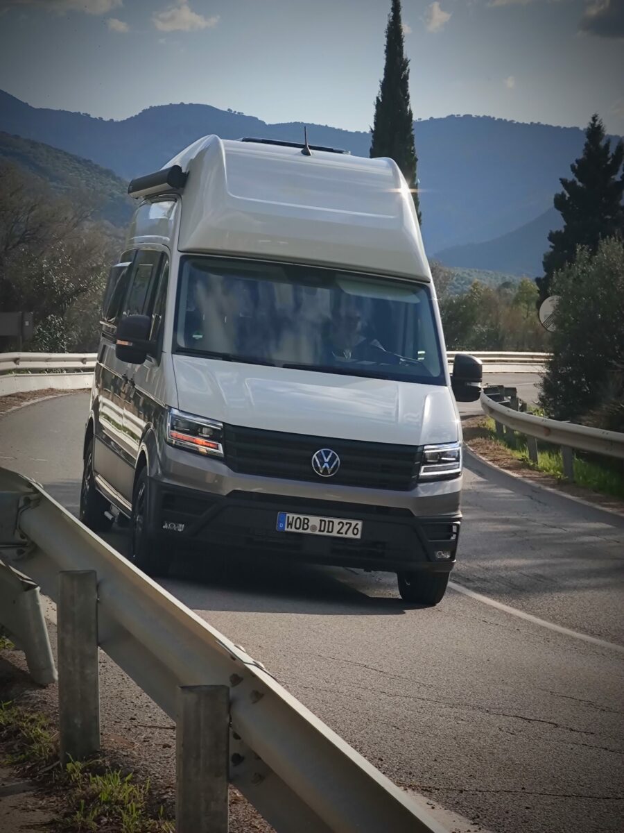 Pe șoselele virajate, camperul se simte ireal de compact și de sigur, mai ales că centrul de greutate este coborât, iar suspensia este reglată suficient de tare pentru a ține frâu celor mai mult de trei tone la gol. Se simte inerția, dar nu și ruliul, de aceea ești mereu stăpân pe situație, și-ți garantez că nu mașina te va opri din savurat șosele sinuoase, ci vasele care se zbenguie prin bufet. Motorul 2.0 TDI stă permanent sub 2000 rpm, dovedind o forță de tracțiune ireală la turații joase și păstrând consumul de motorină, pe parcursul celor 600 km ai testului, în vecinătatea a 10 l/100 km.