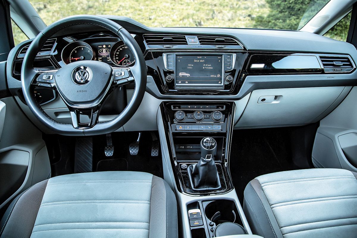 Volumul maxim de încărcare ajunge la 1.857 l, iar cu locurile șase și șapte (opțiune, 698 euro) pliate, acesta este estimat la 633 l. În configurația standard cu doar cinci locuri, aceeași valoare crește la 743 l – record în segment și de două ori mai mult decât în Golf (380 l). Indiferent de varianta aleasă, suprafața de încărcare rămâne mereu plană, iar lățimea și înălțimea portbagajului măsoară 980, respectiv 860 mm. Scaunul pasagerului din dreapta poate fi, de asemenea, rabatat (standard de la Comfortline), ceea ce înseamnă că Touran poate transporta obiecte lungi de 2,7 m.