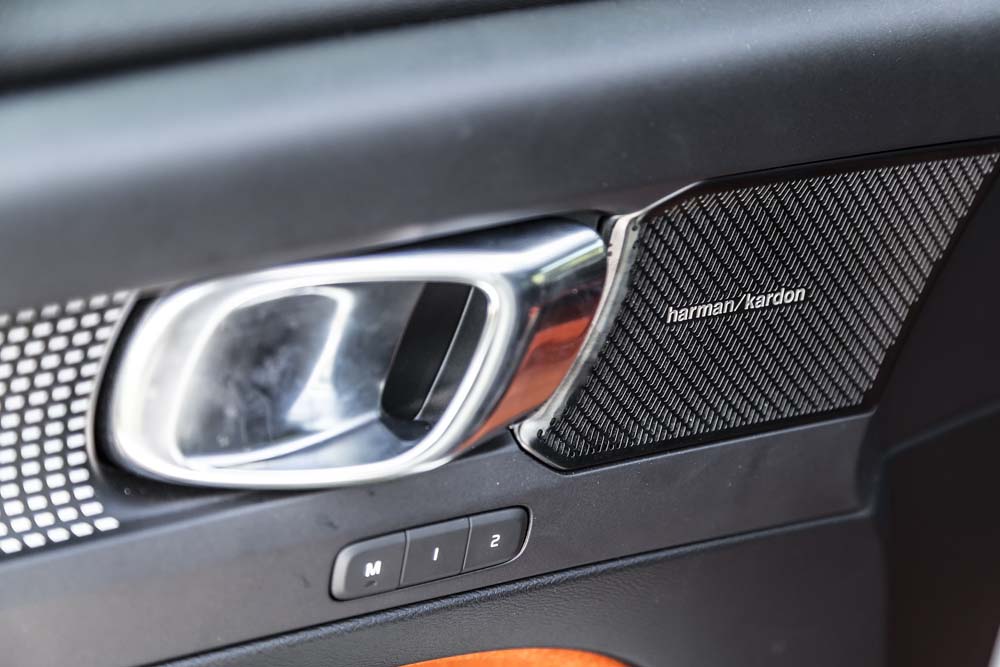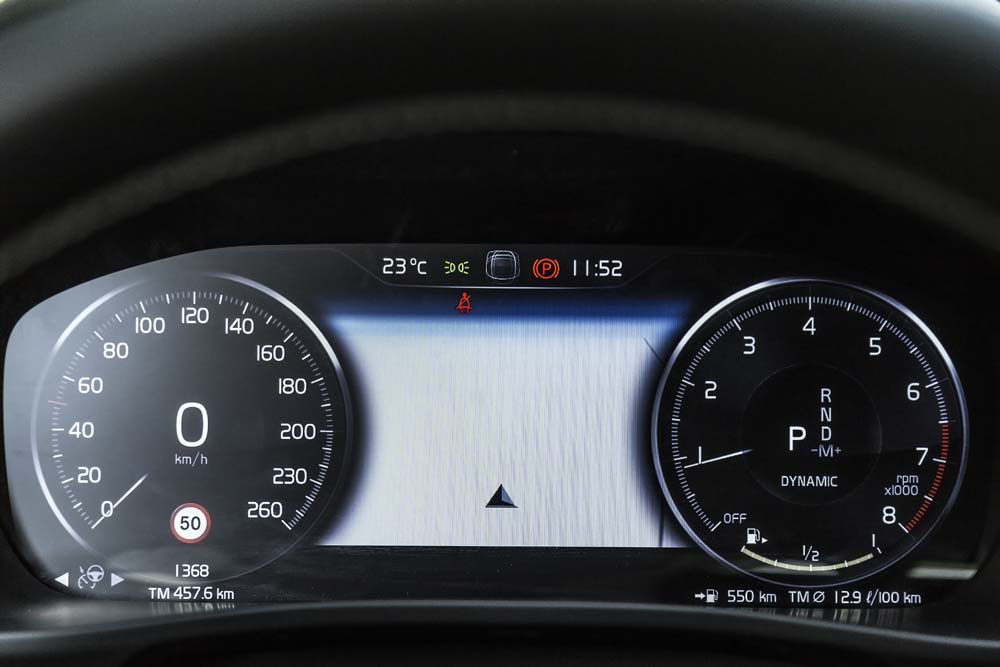 Deschid ușa și admir interiorul tineresc, sportiv, cu suprafețe portocalii și plafon negru, o combinație izbitoare, demnă de performanțele mașinii. Mă așez comod în scaunele cu tapițerie Nubuk textil/piele Nappa, cărora le pot regla inclusiv susținerea lombară (electric) și lungimea șezutului (manual) totul standard pe versiunea R-Design. Inspir pregnantul miros de piele fină, privind instrumentarul de bord digital configurabil cu diagonala de 12,3 inci (standard) și sistemul multimedia cu ecran tactil de 9 inci, în timp ce sistemul se sunet premium Harman/Kardon (750 euro) mă înconjoară cu tonuri clare, bine detaliate.