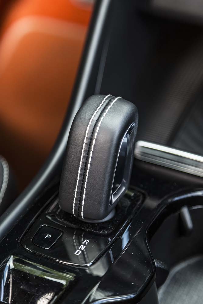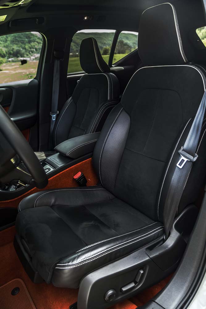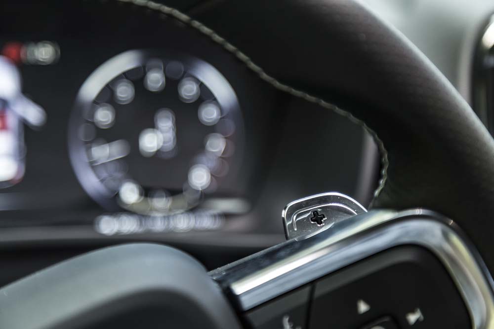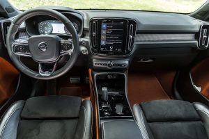 vrut să aflăm cum se comportă cel mai spectaculos XC40 din ofertă, așa că iată-ne la volanul celei mai puternice și luxoase versiuni, T5 AT8 AWD R-Design. Astfel echipat, „roboțelul” sare din prima secundă în ochi: carcasele oglinzilor, ornamentele geamurilor laterale și barele longitudinale de pe plafon, toate „Glossy Black”, accentuează sportivitatea. Le susțin și grila față „R Design”, ca și cele două țevi de eșapament integrate în spoilerul spate. Adevăratele piese de rezistență sunt însă jantele opționale de 20 inci (1.120 euro), care le înlocuiesc pe cele de serie, cu diametrul de 18 inci. Per total – o desfătare pentru ochi, care îmi derulează în minte filme cu cai-putere și viraje strânse.