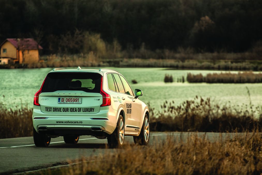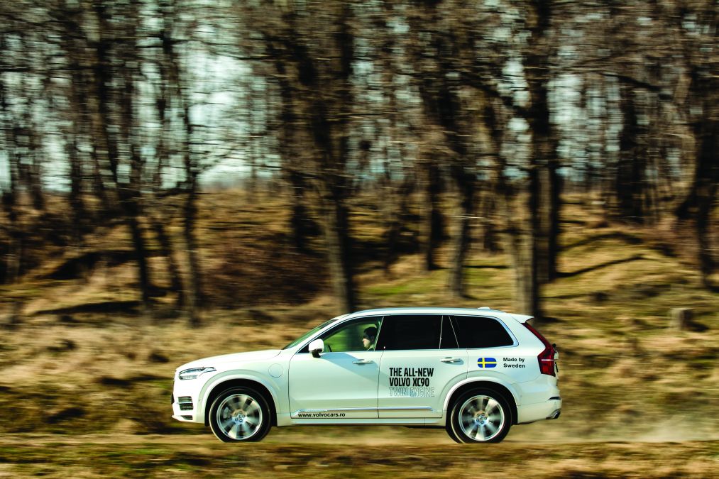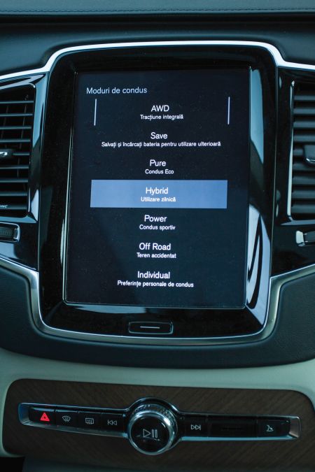 În mod uzual, tranziția între cele două motorizări este controlată automat, în modul Hybrid, la plecarea de pe loc, XC90 glisând în liniște deplină, ajutat exclusiv de motorul electric. Interacțiunea dintre diversele surse de propulsie este extrem de discretă, funcționarea catifelată a cutiei de viteze cu opt trepte având un rol decisiv în conturarea rafinamentului caracteristic sistemului de managament al propulsiei. O apăsare mai hotărâtă a pedalei de accelerație dezvăluie o rezervă arhisuficientă de resurse, tandemul termic-electric străduindu-se să învingă, cu real succes am putea adăuga, inerția celor 2,3 tone ale mașinii. Suspensia pneumatică (2.580 euro) nu face notă discordantă, marele SUV Volvo contracarând orice tip de denivelare cu dezinvoltură, în deplină siguranță și confort. Un alt avantaj este posibilitatea augmentării gărzii la sol până la 23,5 cm pentru abordarea drumurilor mai dificile. Direcția este, însă, rece, distantă, lipsită din păcate de un feeling cu adevărat pertinent. Pseudo-sportivitatea rămâne apanajul rivalilor cu rădăcini germane.