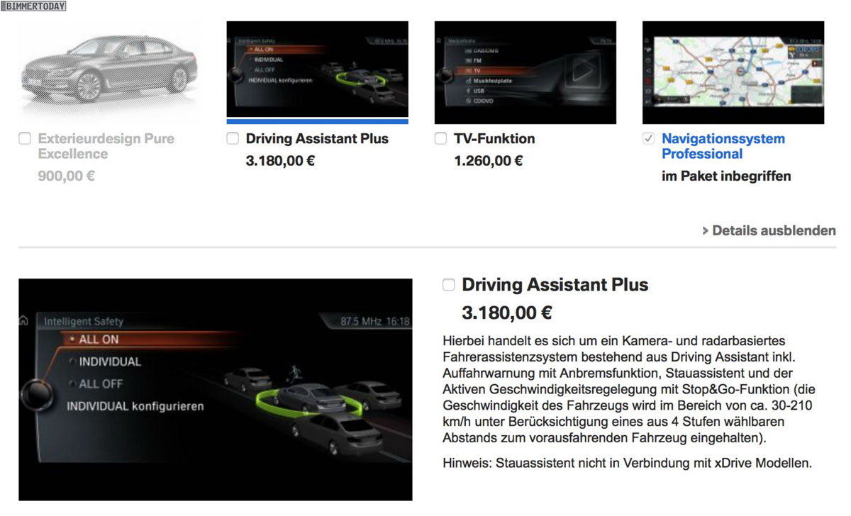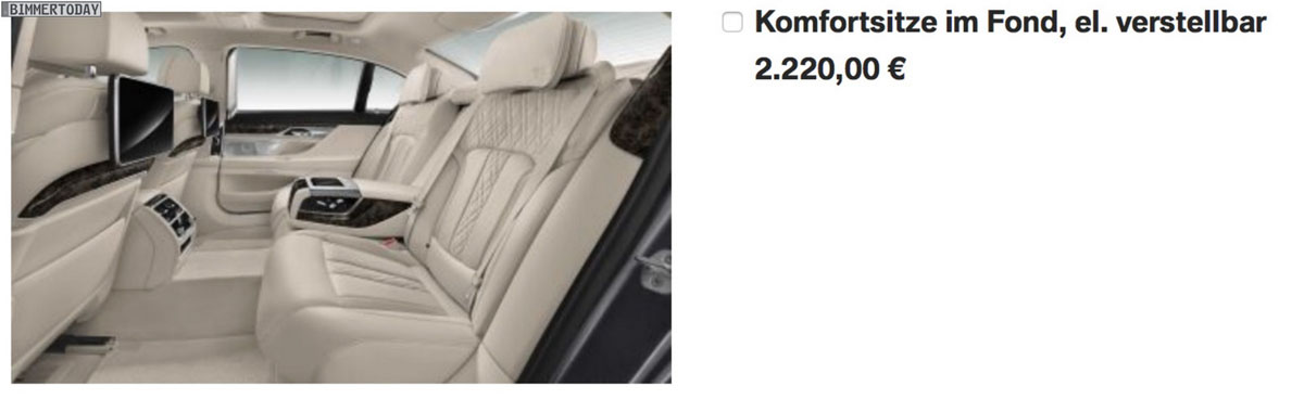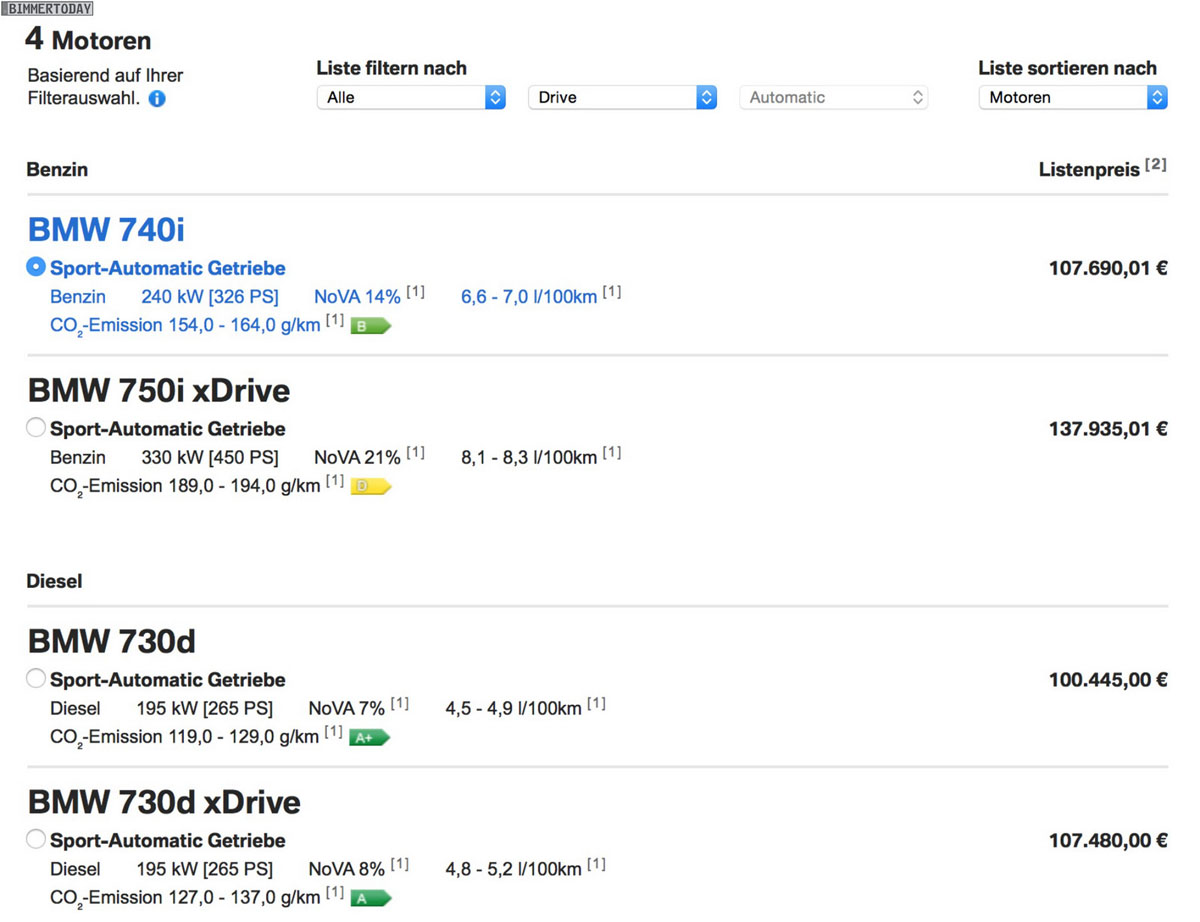 În Austria, prețul de pornire va fi de 100.445 de euro (pentru BMW 730d), în timp ce 740i va pleca de la 107.690 de euro. Dintre opționalele ale căror prețuri au fost desconspirate de configurator sunt farurile adaptive cu LED (1.800 de euro), pachetul M Sport (5.760 de euro), pachetul de asistență la condus (3.180 de euro) sau capitonarea plafonului cu Alcantara de culoare antracit (1.440 de euro).