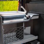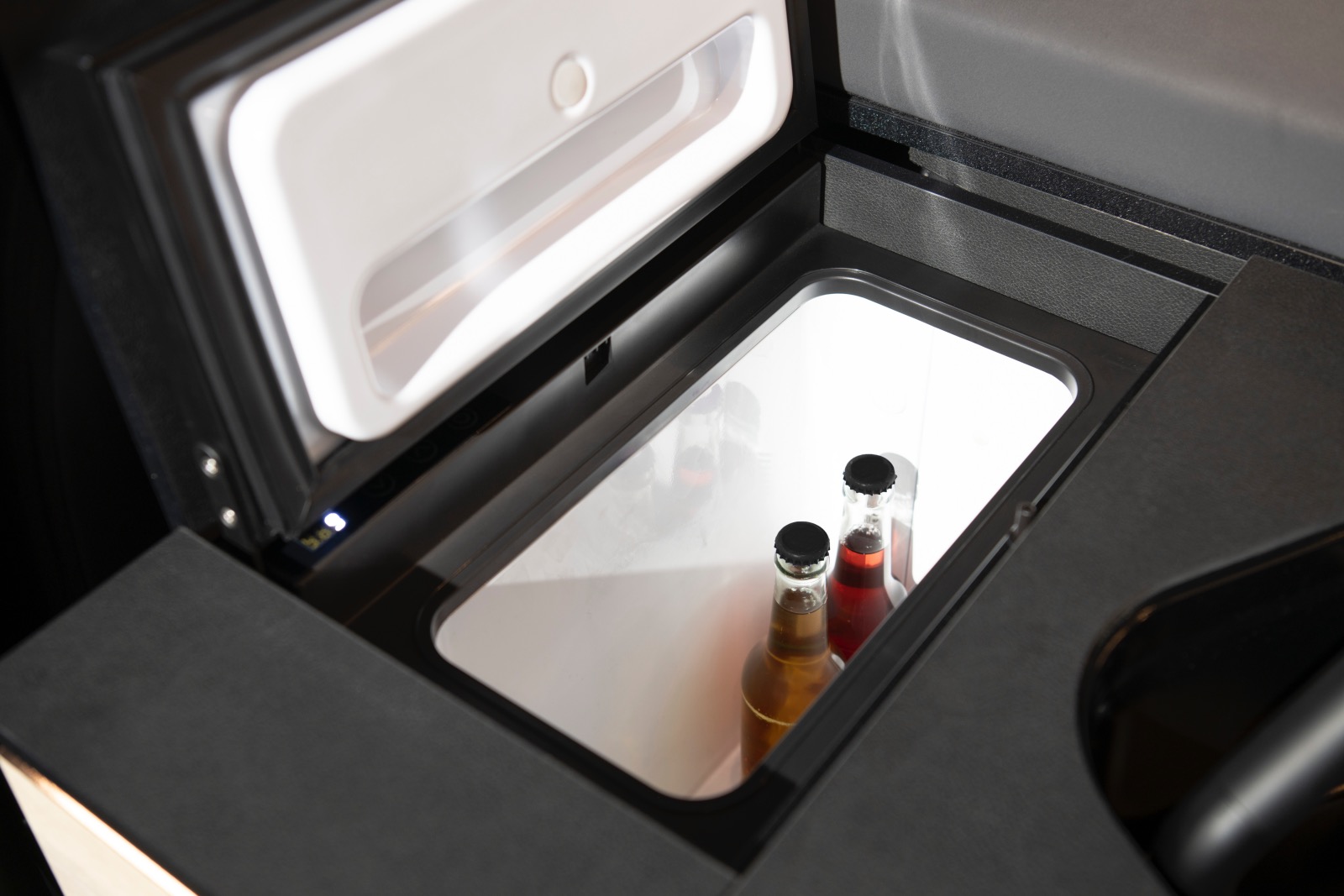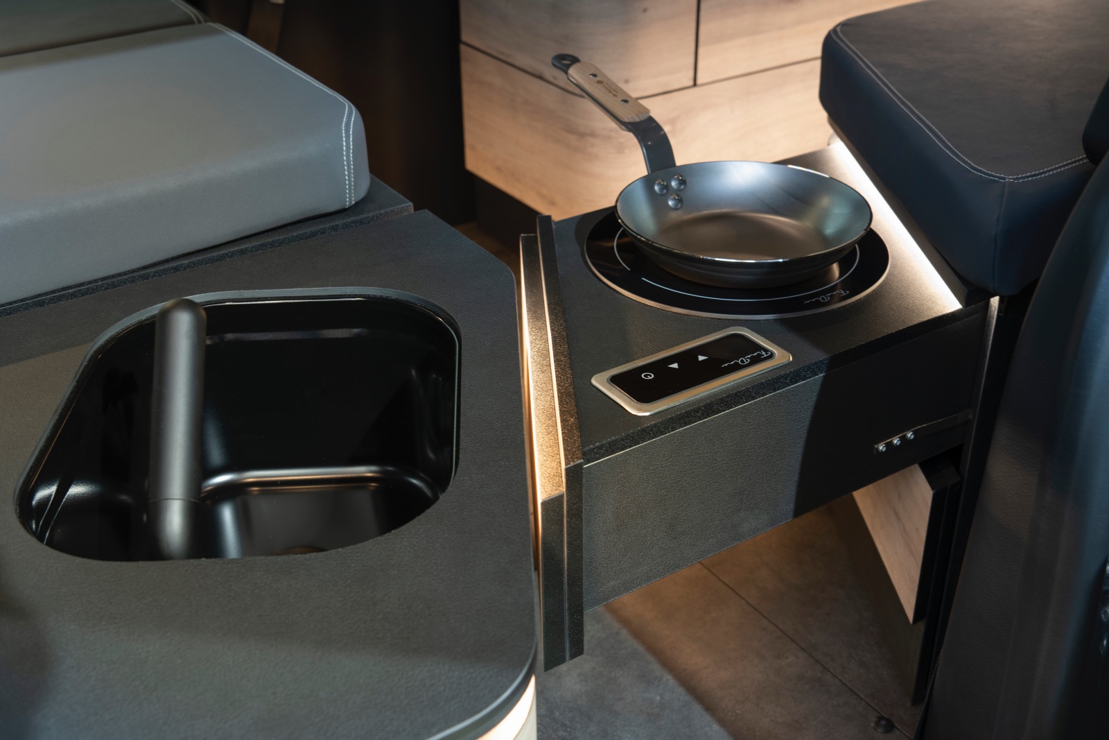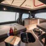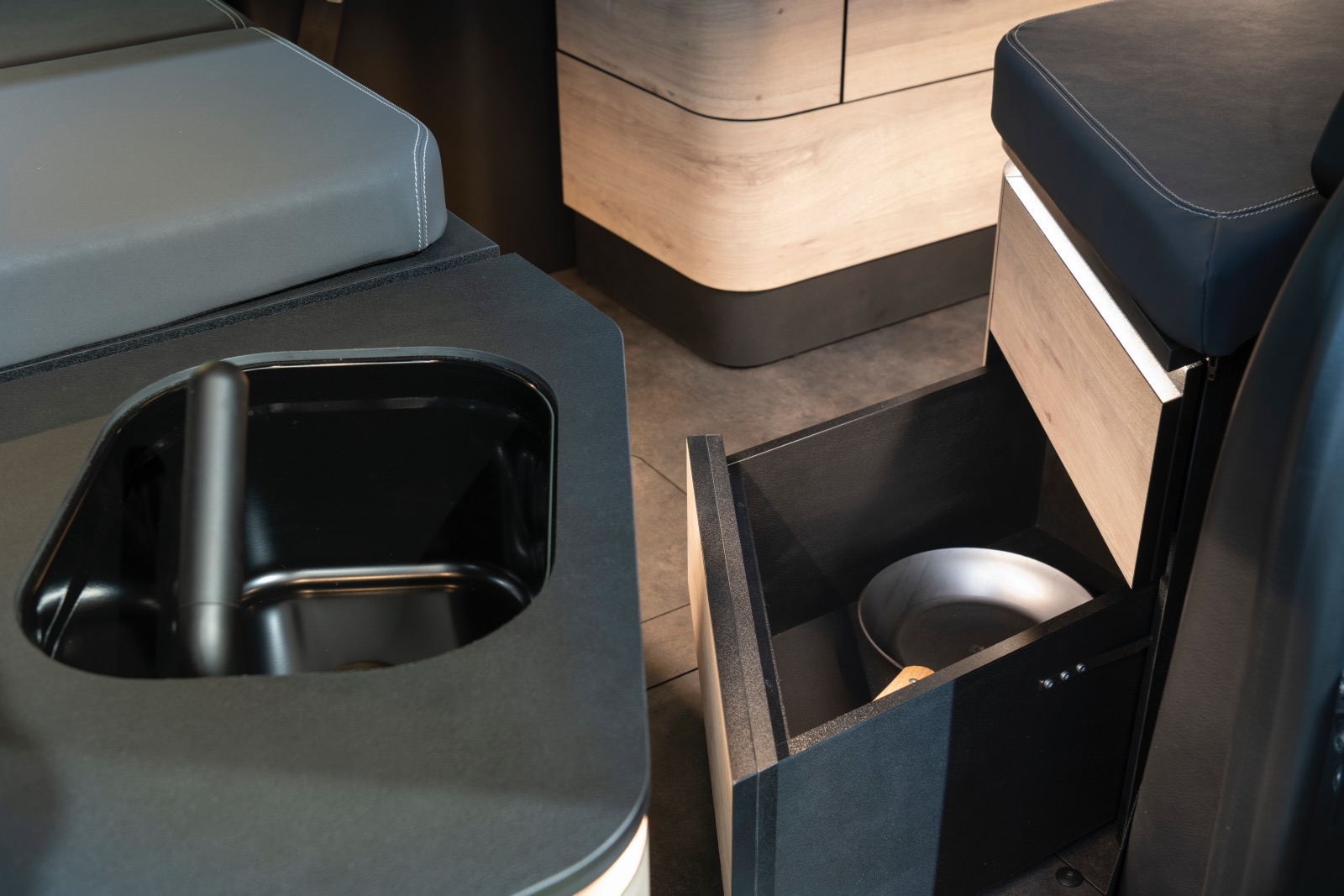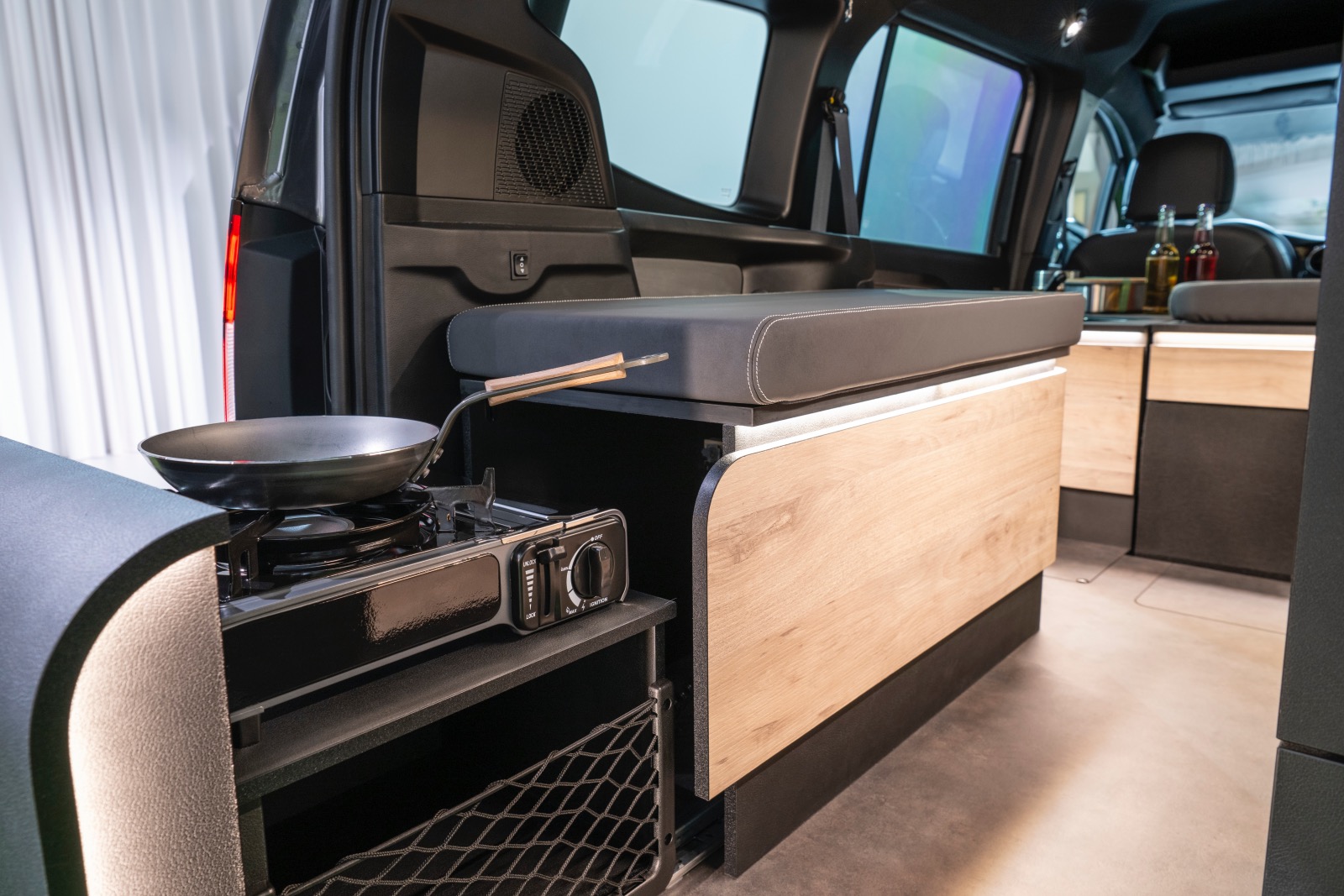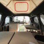 Cadrul patului și salteaua pot fi pliate atunci când nu sunt folosite, astfel că toate cele cinci locuri pot fi folosite la drum. Avem și o micro bucătărie compusă din o chiuvetă cu un rezervor de apă de 12 litri, ladă frigorifică de 15 litri, plită pe gaz (cu butelie detașabilă), diverse spații pentru depozitarea ustensilelor de gătit. Se pot adăuga și scaune de voiaj, deoarece blatul din spate care poate fi folosit la gătit se poate transforma și în masă separată.