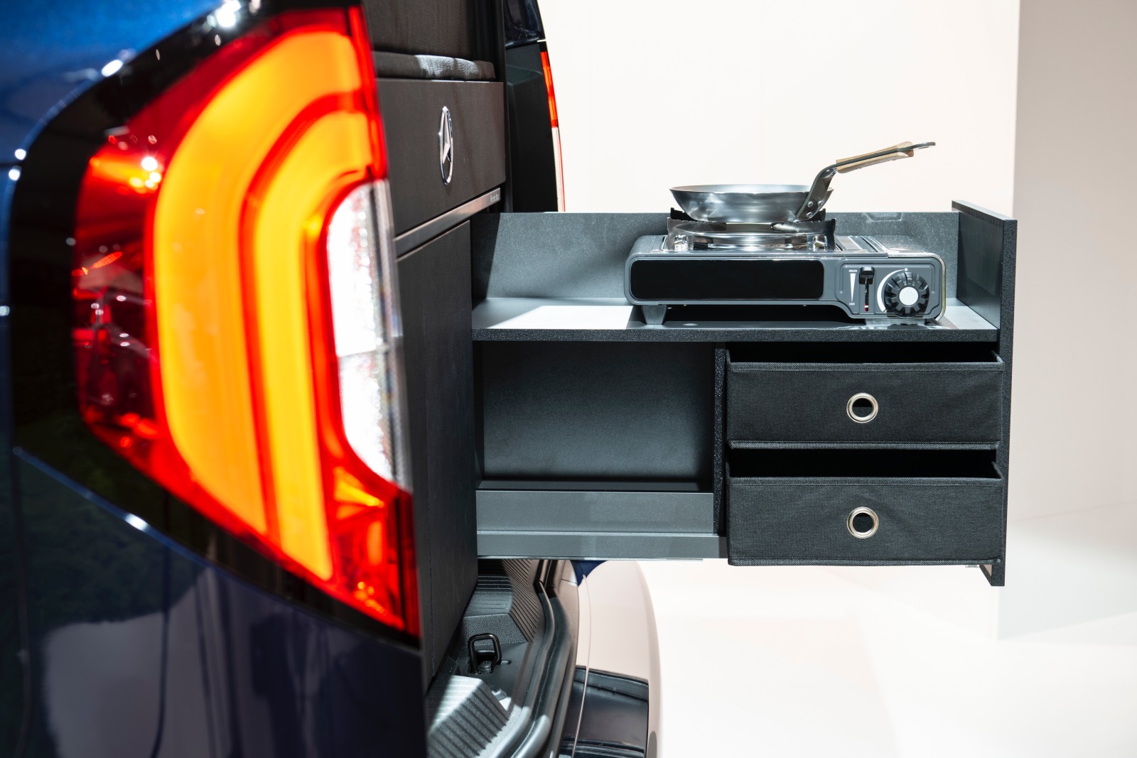 În spatele conceptului EQT, sub amplul hayon, regăsim o a doua zonă de gătit, de data aceasta un arzător cu minibutelie pe gaz, ce poate fi mutat și fi folosit și în aer liber. Conceptul EQT poate oferi spațiu de campare pentru 4 persoane, iar toate echipamentele Marco Polo (dezvoltate împreună cu Brabus Automotive) pot fi demontate în cinci minute și depozitate într-un garaj, de exemplu. Astfel, mașina poate fi folosită și ca vehicul de zi cu zi, fără a transporta de fiecare dată toate elementele necesare pentru camping. Pe concept, Mercedes a testat și o serie de soluții aparte, ca de exemplu, geamuri laterale cu efect mat ce poate fi activat la atingerea unui buton, sau panouri solare amplasate pe plafonul pop-up, pentru producerea de energie suplimentară.