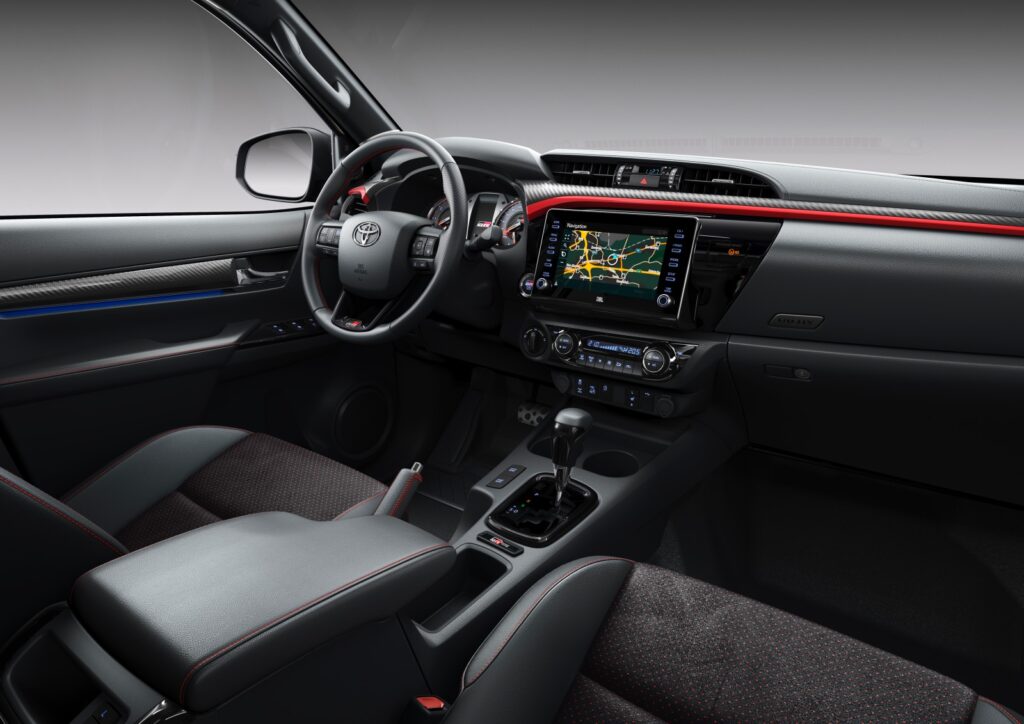 Personalizarea a fost extinsă și la interior, unde Hilux GR Sport propune scaune față sport, pedale din aluminiu, ornamente ce imită fibra ce carbon și inserții roșii specifice modelelor GR Sport.