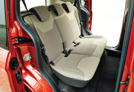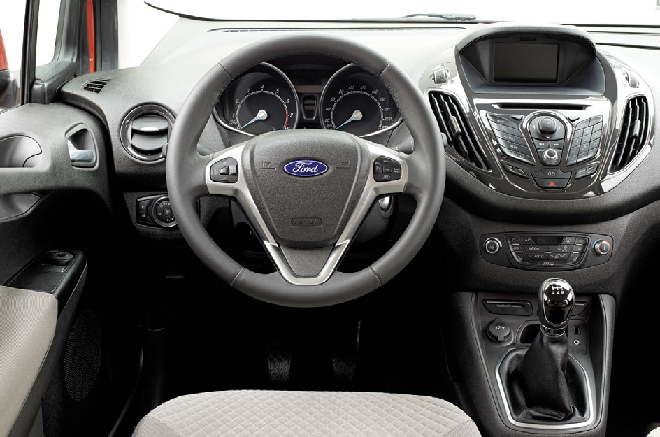 Rezultatul este o mașină a cărui design exterior aduce doar câteva elemente similare modelului de clasă mică, dar care reușește cu brio să camufleze masivitatea caroseriei, în special pe verticală. Formele angulare din partea din spate sunt pur funcționale și favorizează atât capacitatea maximă de încărcare cât și orientarea în cazul manevrelor de parcare. În fapt, vizibilitatea generală este excelentă pe toate direcțiile grație poziționării relativ înalte a scaunului șoferului. Tot la interior am sesizat și planșa de bord cu elemente preluate de la Fiesta, montate pe o arhitectură ceva mai masivă, diferențele majore fiind resimțite în cazul fețelor portierelor, redesenate total pentru a completa poziția mai înaltă la volan. În cazul versiunii Tourneo, bancheta poate acomoda fără probleme trei pasageri adulți cu spațiu excesiv pe verticală și mai mult decât suficient pe orizontală. Personal, la un 1,85 m, am reușit să mă fac comod fără probleme în spatele unui coleg chiar mai înalt, un lucru pe care nu îl pot spune despre multe modele din clasele imediat superioare.