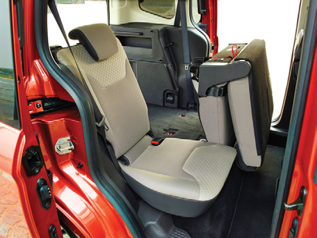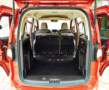 Accesul este și el ideal prin intermediul celor două uși glisante pe care oficialii Ford au avut grijă să le supună unor teste excesiv de dure efectuând 250.000 de operațiuni de deschidere/ închidere. Tot în cazul lui Tourneo, volumul portbagajului măsoară 730 l standard, cu 60 mai mult comparativ cu concurenții direcți și poate acomoda până la 1.656 pe toate direcțiile grație poziționării relativ înalte a scaunului șoferului. Tot la interior am sesizat și planșa de bord cu elemente preluate de la Fiesta, montate pe o arhitectură ceva mai masivă, diferențele majore fiind resimțite în cazul fețelor portierelor, redesenate total pentru a completa poziția În cazul versiunii Tourneo, bancheta poate acomoda fără probleme trei pasageri adulți cu spațiu excesiv pe verticală și mai mult decât suficient pe orizontală. Personal, la un 1,85 m, am reușit să mă fac comod fără probleme în spatele unui coleg chiar mai înalt, un lucru pe care nu îl cu bancheta rabatată.