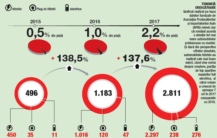 Anul trecut ponderea celor din urmă a reprezentat 2,2% din piață, BMW (166 de unități), Renault (98) și Volkswagen (83) fiind mărcile cu cele mai bune rezultate în ceea ce privește modelele electrice și plug-in hibrid, în timp ce Toyota (2.063 exemplare), Lexus (154), liderul segmentului SUV-urilor mari, și Kia (22) sunt pe podiumul hibridelor. Un alt aspect interesant este faptul că în segmentul vehiculelor full electrice, un producător premium, BMW (cu modelul i3, vândut în 118 exemplare), devansează mărcile de volum, fără a neglija însă să semnalăm rezultatul meritoriu înregistrat de Renault Zoe (98 de unități). Rezultatele din primul trimestru al acestui an arată că și în 2018 vom asista la o creștere a pieței propulsiei alternative. În perioada amintită s-au comercializat 661 de unități, mai multe decât în întreg anul 2015. Potrivit datelor oficiale, din acest total, 201 sunt mașini electrice și plug-in hibrid, echivalentul unui salt de până la cinci ori (+390,2%) faţă de primele trei luni din anul 2017, iar 460 de unităţi sunt hibride (+25,7%). Ponderea din totalul pieței este la nivelul întregului an 2017, 2,2%, dar mai mare decât cea consemnată în aceeași perioadă a anului trecut, când era de 1,7%. Și aceasta în condițiile în care nu debutase Programul Rabla, prin care, potrivit estimărilor Ministerului Mediului, acestea ar urma să se vândă în acest an în peste 2.000 de unități.